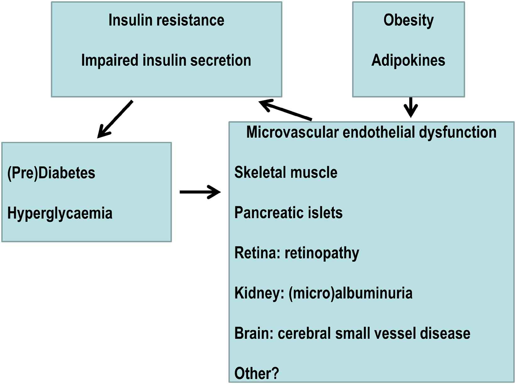 Microvascular and metabolic physiology are inextricably linked. I here propose that dysfunction of the one causes dysfunction of the other, justifying the concept of a ‘Metabolic-Microvascular Dysregulation Syndrome’. For example, metabolic dysregulation (hyperglycaemia) causes microvascular dysfunction, diabetic retinopathy and diabetic nephropathy. Conversely, microvascular dysregulation impairs insulin-mediated glucose disposal, i.e. causes insulin resistance, impairs insulin secretion, and is associated with onset of type 2 diabetes in prospective studies. Obesity is a key driver of the Metabolic-Microvascular Dysregulation Syndrome, as it impairs insulin signal transduction in endothelial cells through adverse changes in adipokines such as adiponectin, free fatty acids and tumour necrosis factor-α. Microvascular dysfunction in obesity appears reversible by diet-induced weight loss. Next to obesity, other factors are also likely to play a role. Examples are microvascular dysfunction of adipose tissue as a primary cause of adipose tissue dysfunction; early life exposures, both antenatal and postnatal; and large artery stiffening. Large artery stiffening is unquestionably important for microvascular function in susceptible organs such as the brain, the eye and the kidney but whether it can cause microvascular dysfunction in metabolically crucial tissues such as skeletal muscle, pancreas and adipose tissue has not been studied. It is therefore not clear that arterial stiffening in and of itself is sufficient to cause the Metabolic-Microvascular Dysregulation Syndrome.