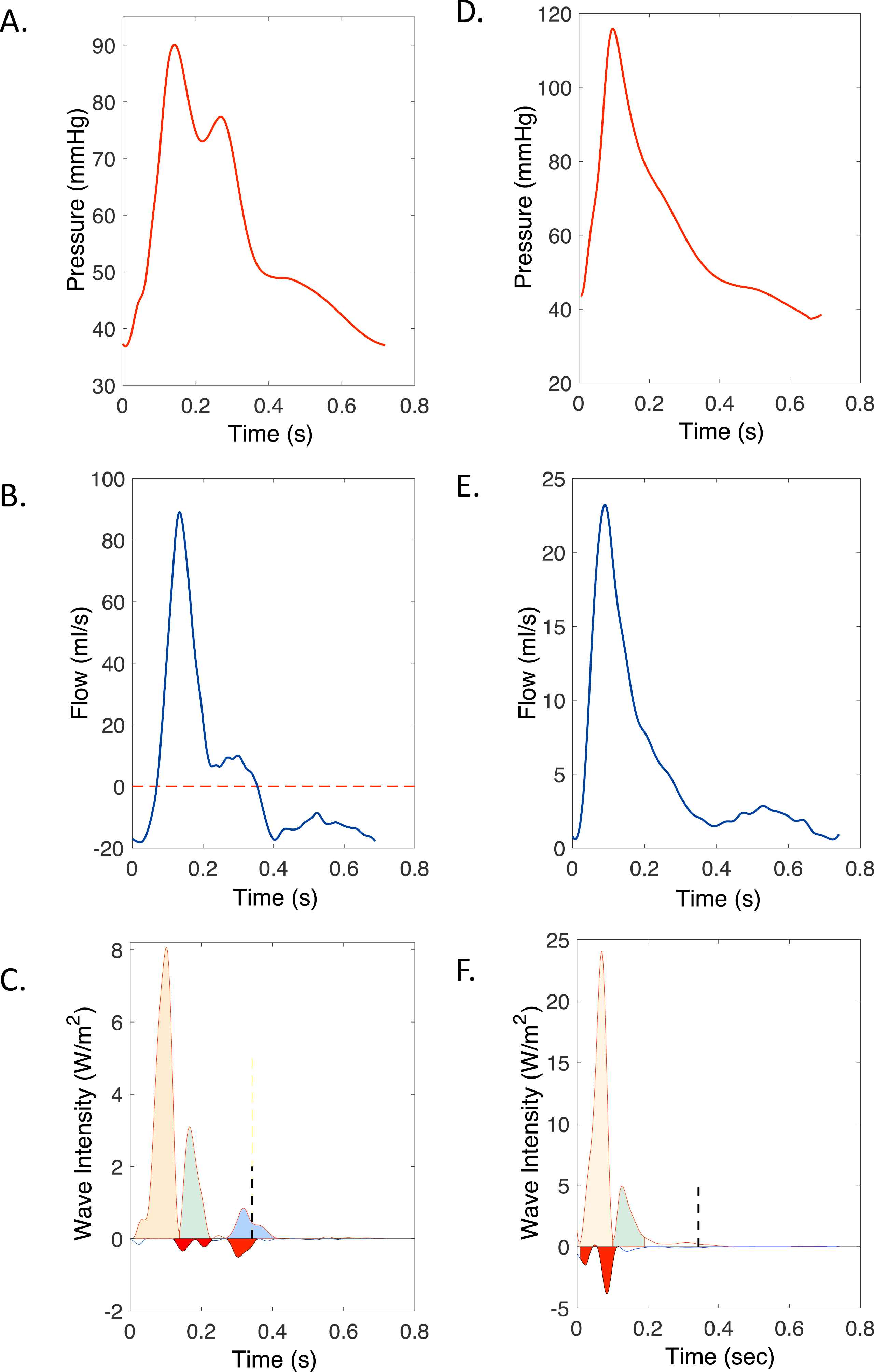 Carotid (A–C) and radial (D–F) pressure (top panels, A and D), flow (middle-panels, B and E) and wave intensity (C and F). In C and F, forward-traveling waves are plotted as positive intensity, whereas backward-traveling waves are plotted as negative intensity. The vertical dashed lines in C and F mark the duration of ventricular ejection after correcting for wave transmission delays to the respective measurement sites. The carotid pulse is bisferiens, due to an abnormal forward-traveling suction wave in mid-systole (green area in C), which follows the normal forward compression wave (orange area) generated by ventricular contraction. The radial pulse (D) has a “water hammer” configuration, with a sharp upstroke and downstroke. As demonstrated by WIA (F), the mid-systolic expansion wave transmitted from the central circulation to the radial artery (green area) is responsible for the sudden radial pressure descent after its initial peak, resulting in its “water hammer” configuration. Note that the pressure drop occurs well within systole. The red areas in the carotid and radial wave intensity represent wave reflections from the head and hand, respectively. (For interpretation of the references to color/colour in this figure legend, the reader is referred to the Web version of this article.)