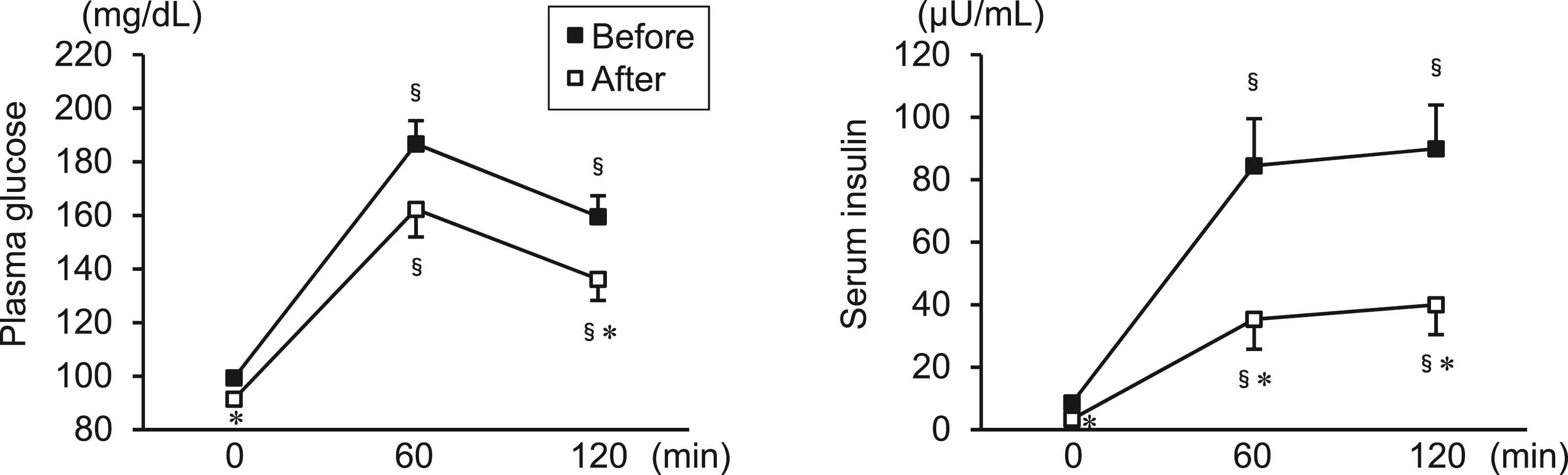 Figure 1 shows the plasma glucose and serum insulin levels during 75-g OGTT before and after the diet program. Glucose loading significantly increased the plasma glucose and serum insulin levels for 120 min both before and after the diet program. After the program, plasma glucose levels at 0 min (mean ± SE; before to after the program; 99 ± 2 to 91 ± 2 mg/dL, p = 0.001) and 120 min (160 ± 8 to 136 ± 8 mg/dL, p = 0.010) had decreased significantly. The plasma glucose levels at 60 min (187 ± 9 to 162 ± 10 mg/dL, p = 0.071) exhibited a borderline significant difference between before and after the program. The serum insulin levels at 0 min (8.6 ± 1.3 to 3.4 ± 0.3 μU/mL, p = 0.001), 60 min (84.5 ± 15.0 to 35.4 ± 9.6 μU/mL, p = 0.001), and 120 min (89.9 ± 14.0 to 40.0 ± 9.6 μU/mL, p = 0.002) had significantly decreased after the diet program. As a result, HOMA-IR decreased significantly after the diet program (Table 1).