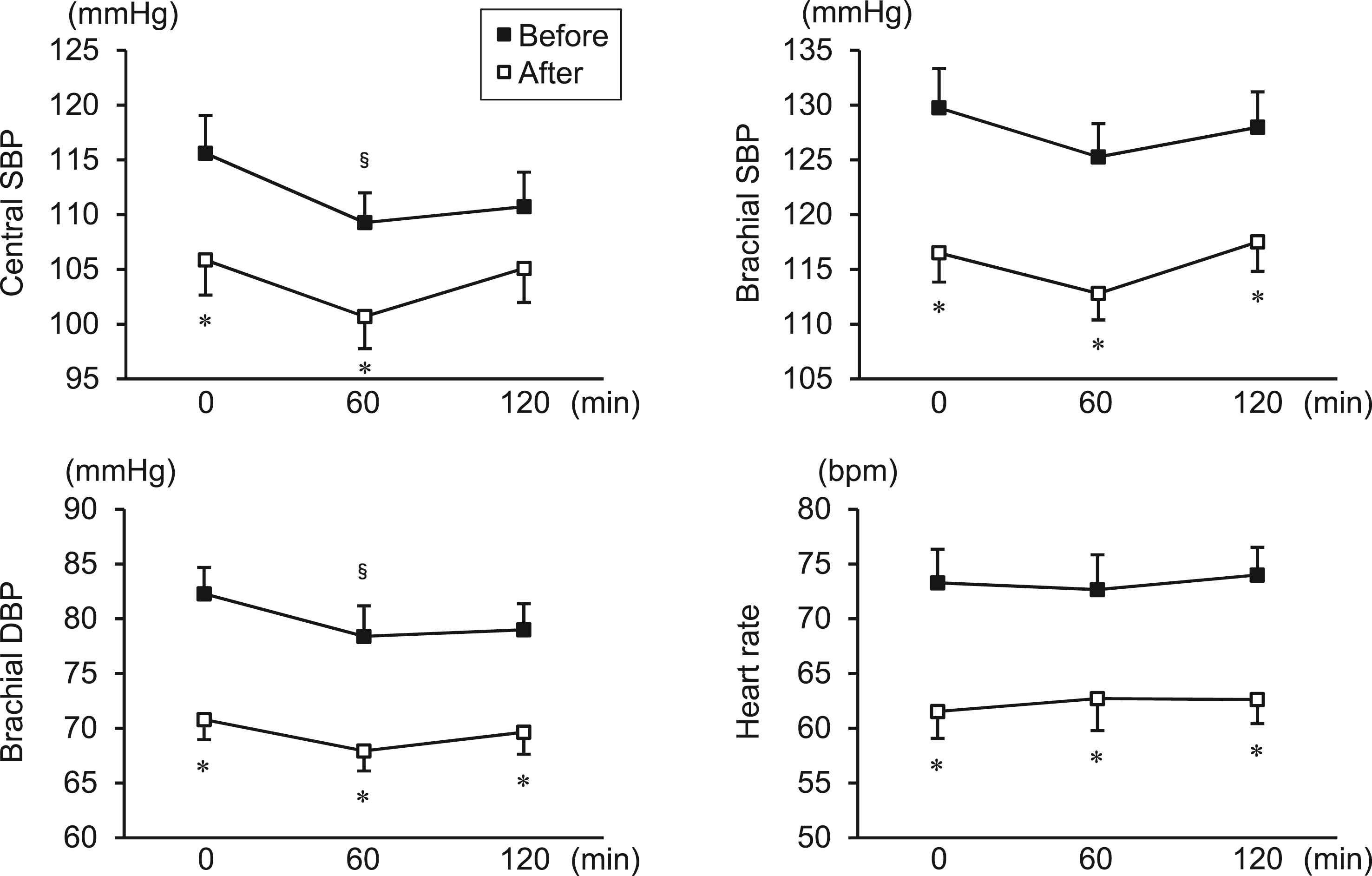 On the other hand, the mean change in fasting brachial SBP after the diet program was −13 mmHg (mean ± SE; before to after the program; 130 ± 4 to 117 ± 3 mmHg, p = 0.002). A meta-analysis29 that included approximately 5000 participants reported that a change in brachial SBP was −1.1 mmHg (95% CI; −1.4 to −0.7 mmHg) per kg of weight loss. In agreement with this estimate, the current results showed a brachial SBP change of −1.3 mmHg per kg of weight loss, confirming the importance of weight management for blood pressure control. The magnitude of SBP reduction after the diet program was significantly greater in brachial artery than in central aorta at any time point during 2-h OGTT (all p < 0.01). As discussed above, this was probably due to the considerable decrease in heart rate. Therefore, it should be noted that a diet-induced reduction in brachial SBP with substantially decreased heart rate will overestimate an effect of dietary intervention on cSBP.