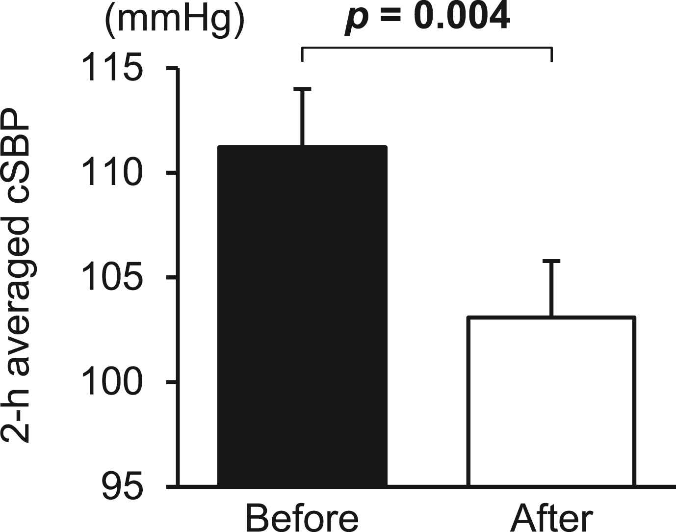 Figure 2 shows the blood pressure and heart rate during 75-g OGTT before and after the diet program. The brachial SBP, brachial DBP, and heart rate at all time points were significantly decreased after the diet program. The 12-week program resulted in significant reductions of cSBP at 0 min (mean ± SE; before to after the program; 116 ± 3 to 106 ± 3 mmHg, p = 0.005) (mean change from baseline [95% CI]; −9.7 [−16.1 to −3.4] mmHg) and 60 min (109 ± 3 to 101 ± 3 mmHg, p = 0.005) (−8.6 [−14.2 to −3.0] mmHg) and a borderline significant decrease in cSBP at 120 min (111 ± 3 to 105 ± 3 mmHg, p = 0.083) (−5.6 [−12.1 to 0.8] mmHg). Consequently, the 2-h averaged cSBP during OGTT significantly decreased after the diet program (111 ± 3 to 103 ± 3 mmHg) (−8.1 [−13.2 to −3.1] mmHg) (Fig. 3).