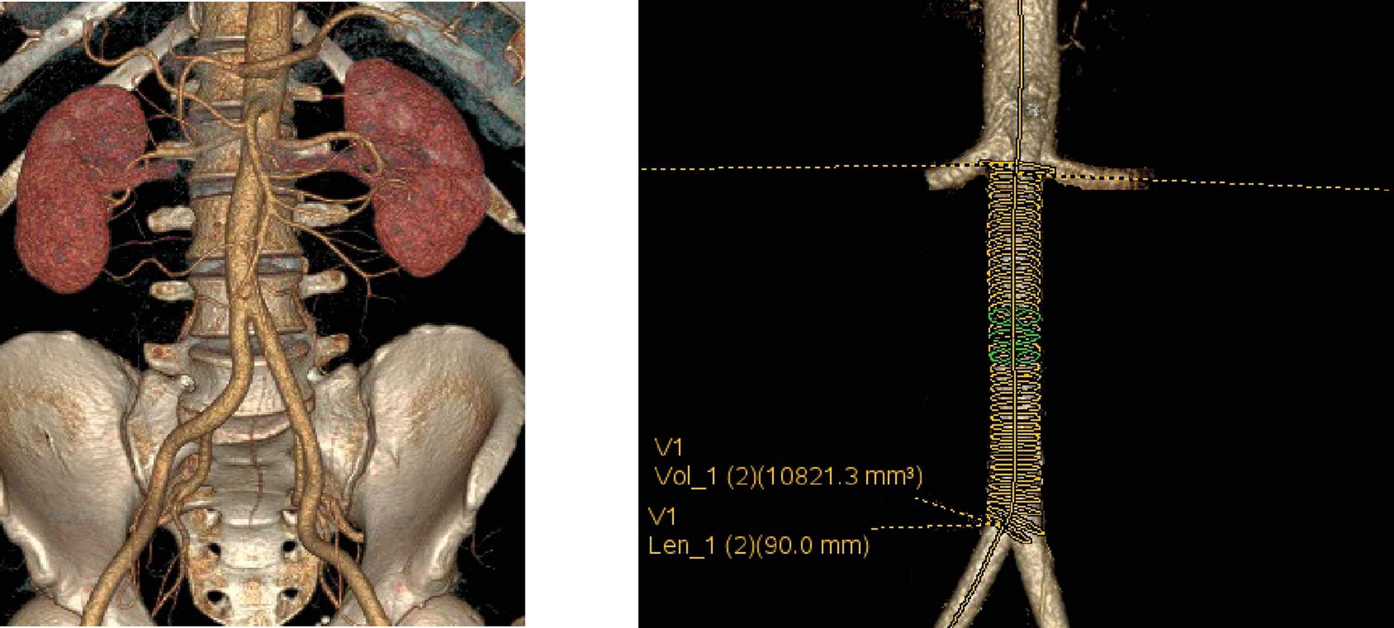 All patients underwent CTA of the aorta with contrast-enhanced arterial phase. The study was conducted on a 64-detector – GE Optima 660, equipped with a synchronized injector. These axial sections were processed on the workstation AW Volume Share 5. Automatic bolus tracking system for arterial phase was used. Then, on the workstation 660 GE Optima, with help of the preinstalled software, the indicators of aortic volume in cm3, the maximum diameter of the aorta and its length in millimeters (mm) was calculated. In order to accurately determine the IA volume, kidney artery was chosen as a start point of calculations and the aortic bifurcation was used as the end point (Fig. 1).