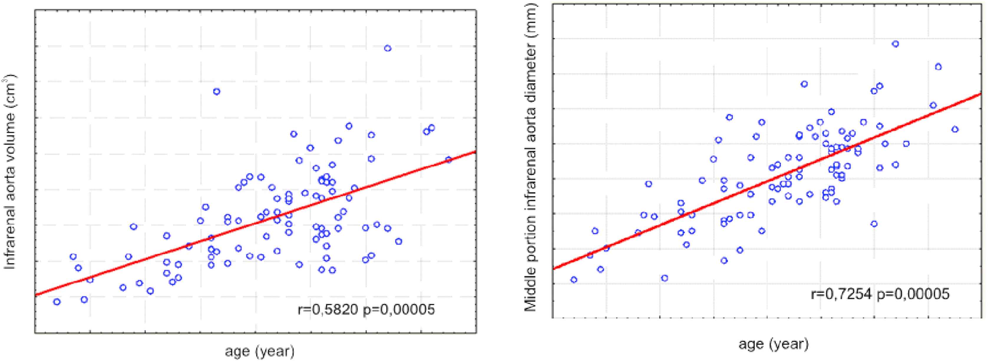 Analysis of the data has established a significant strong correlation between the age and the diameter/volume of the aorta. It was noted that with the increase in age, there was an increase in the diameter of the IA and IA volume (Fig. 2). Moreover, the increase in diameter of the aorta was identified in both men (r = 0,56, p < 0,05) and women (r = 0,54, p < 0,05).