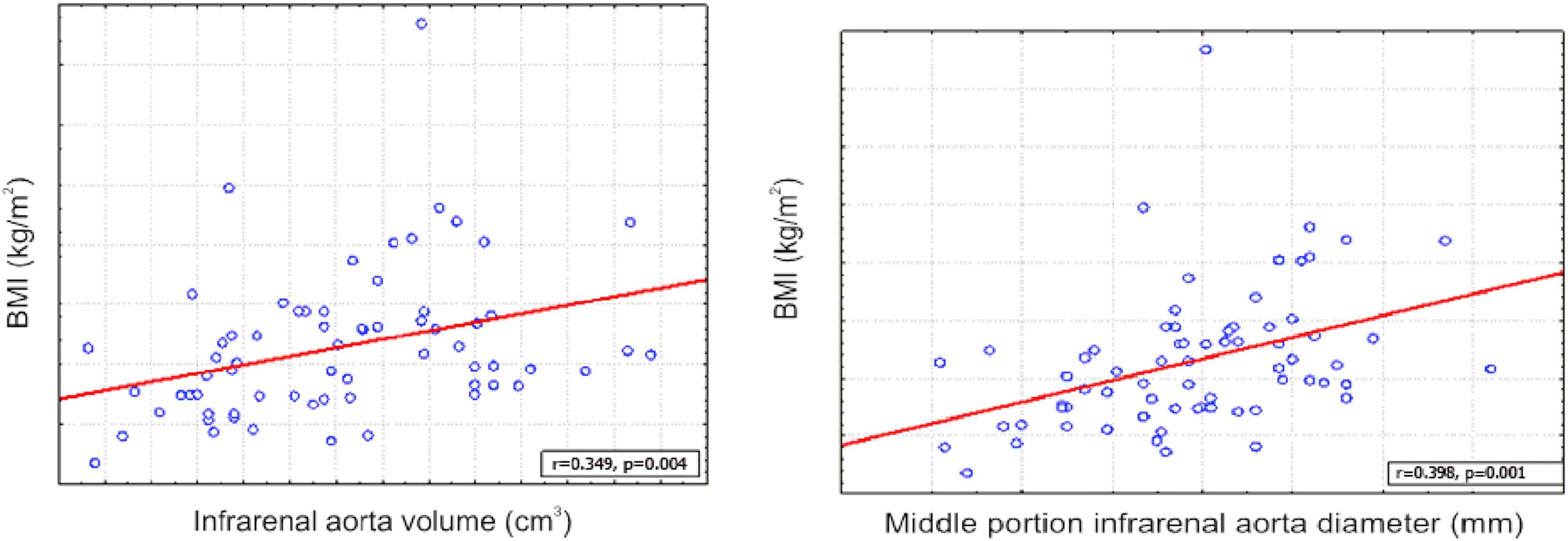 We analyzed BMI with respect to the diameter and volume of the aorta (Fig. 3). There was a significant correlation of the medium strength, which showed that with the increase in BMI there was an increase in the diameter (r = 0,4, p = 0,0007) and volume of IA (r = 0,3, p = 0,004).