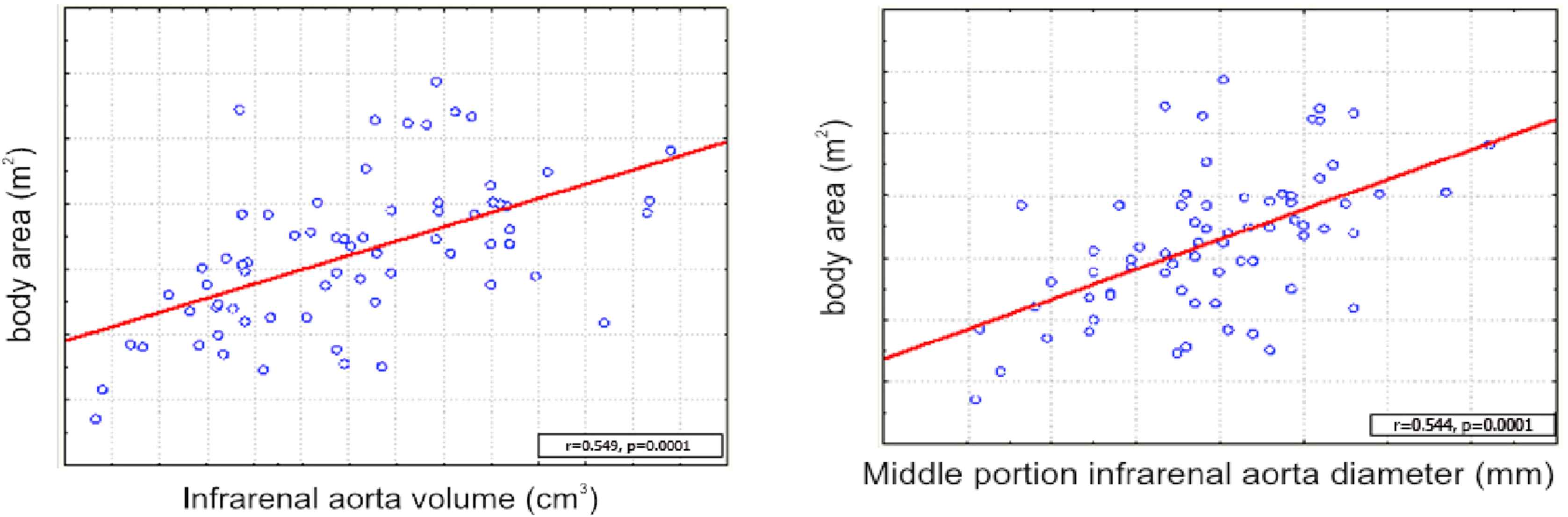 This study uncovered a significant strong correlation between the body surface area and the diameter/volume of the IA aorta (r = 0,54, p < 0,05). That meant that increasing the body surface area caused a significant increase in the diameter and volume of the IA (Fig. 4), however the correlation between BMI and diameter/volume of the aorta was weak (r = 0,3, p < 0,05). This may indicate that an increase in aortic diameter depends on body surface area, but not BMI.