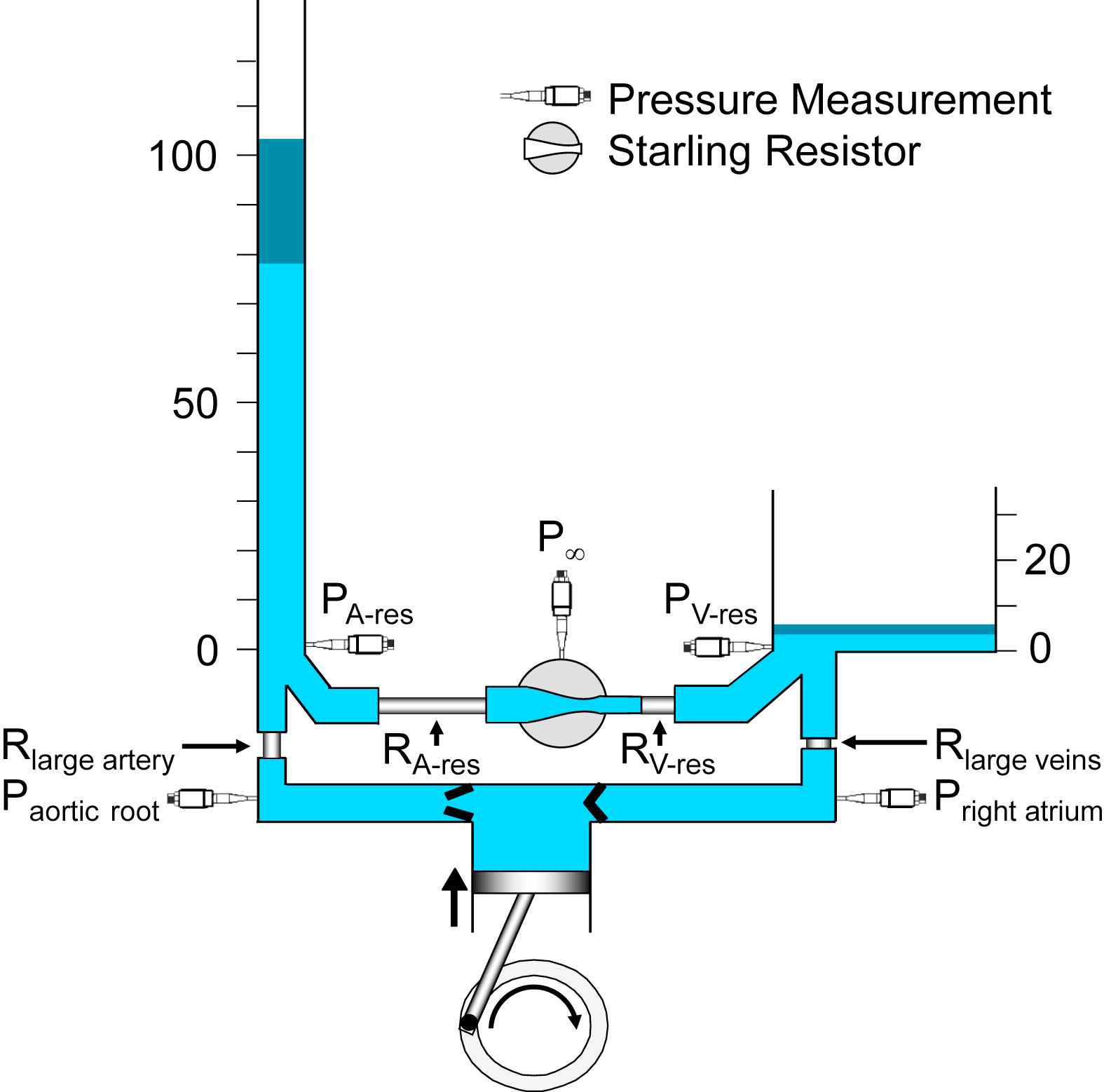 A hydraulic model of the systemic circulation illustrating the essential features of the reservoir-wave approach. The left ventricle is represented by the cylinder and piston, coupled to a crank. Pressure transducers are represented schematically. Note that arterial (PA-res) and venous (PV-res) pressures are measured at the bottom of their respective reservoirs, thus reflecting the height of the column of liquid, measured in mmHg. The dark-blue segments at the tops of the arterial and venous reservoirs indicate the typical amplitudes of the changes in reservoir pressures. Aortic root (Paortic root) and right atrial (Pright atrium) pressures are respectively higher and lower than their reservoir pressures, because of the flow-related pressure drops across the large artery (Rlarge artery) and large vein (Rlarge veins) resistances. The relative magnitudes of the resistances are represented by their lengths and correspond approximately to the values calculated from data measured in the normal dog.37 The Starling resistor between the arterial reservoir (RA-res) and venous reservoir (RV-res) resistances is represented schematically as a pressurized chamber (P∞) that encloses a collapsible segment of tubing.