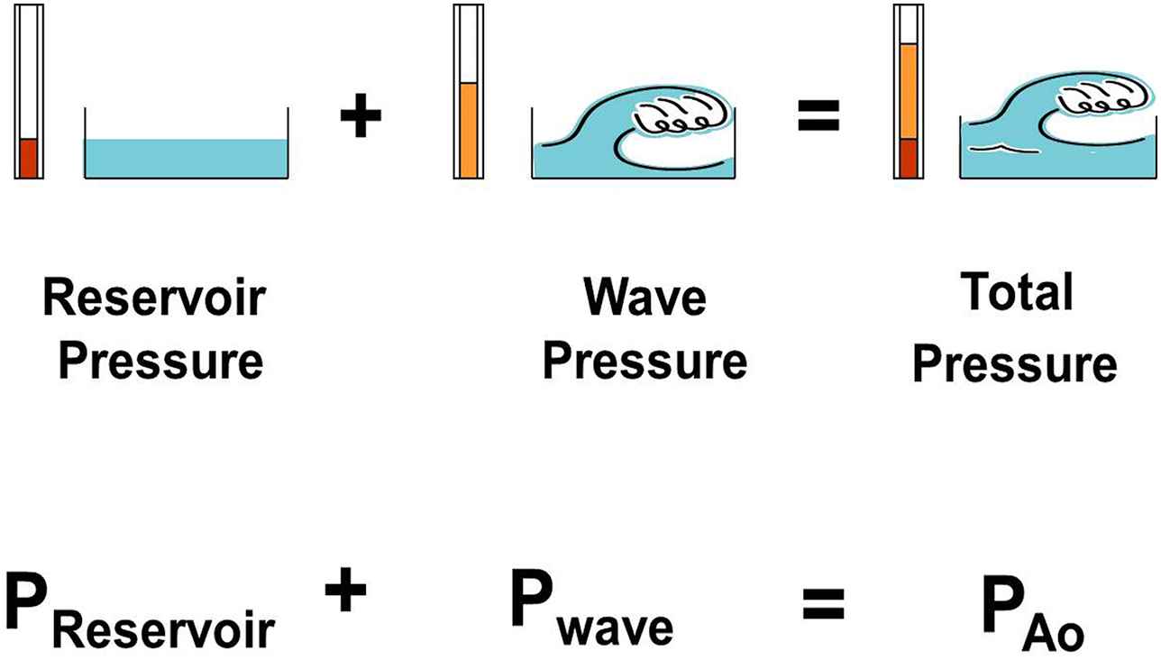 A figure illustrating the concept that changes in measured aortic pressure are equal to the sum of the changes in reservoir pressure and wave (excess) pressure. (From Tyberg et al.15 with permission of Elsevier Ireland Ltd.)