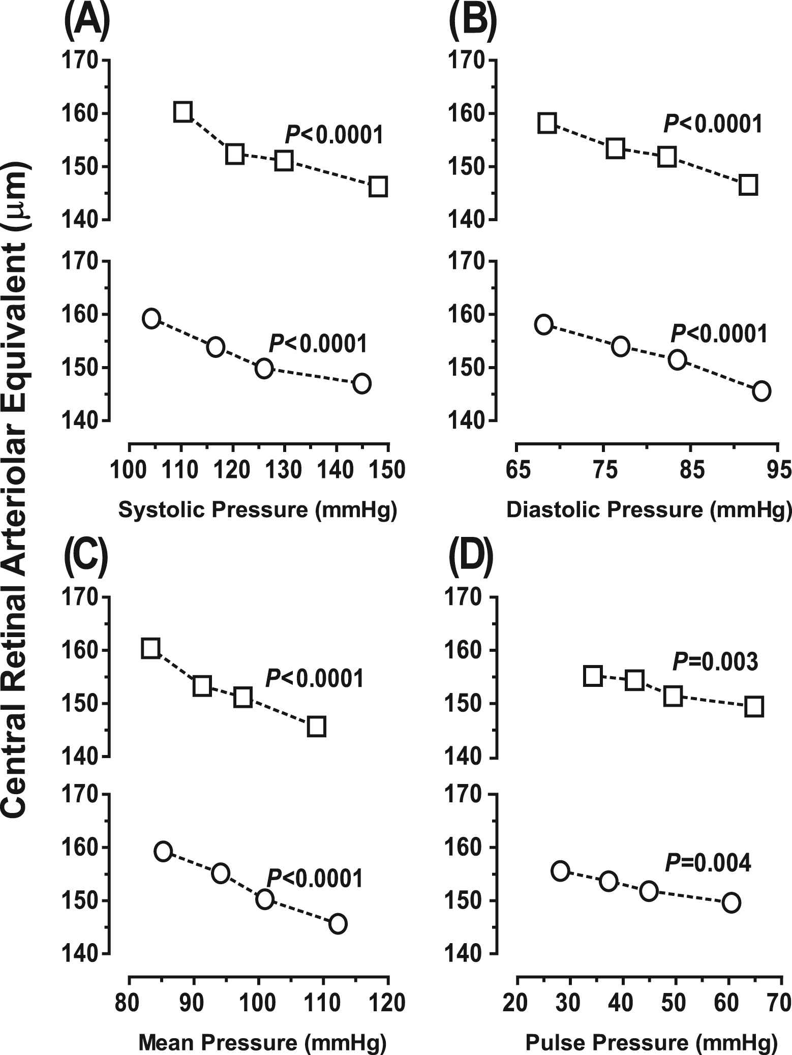 Central retinal arteriolar equivalent across increasing quartiles of systolic (A), diastolic (B), mean (C) and pulse (D) pressure, as measured peripherally (□) or centrally (O) in 514 participants (261 women and 253 men). p Values denote the significance of linear trend. None of the sex-by-trend interaction terms reached significance (p ≥ 0.16).