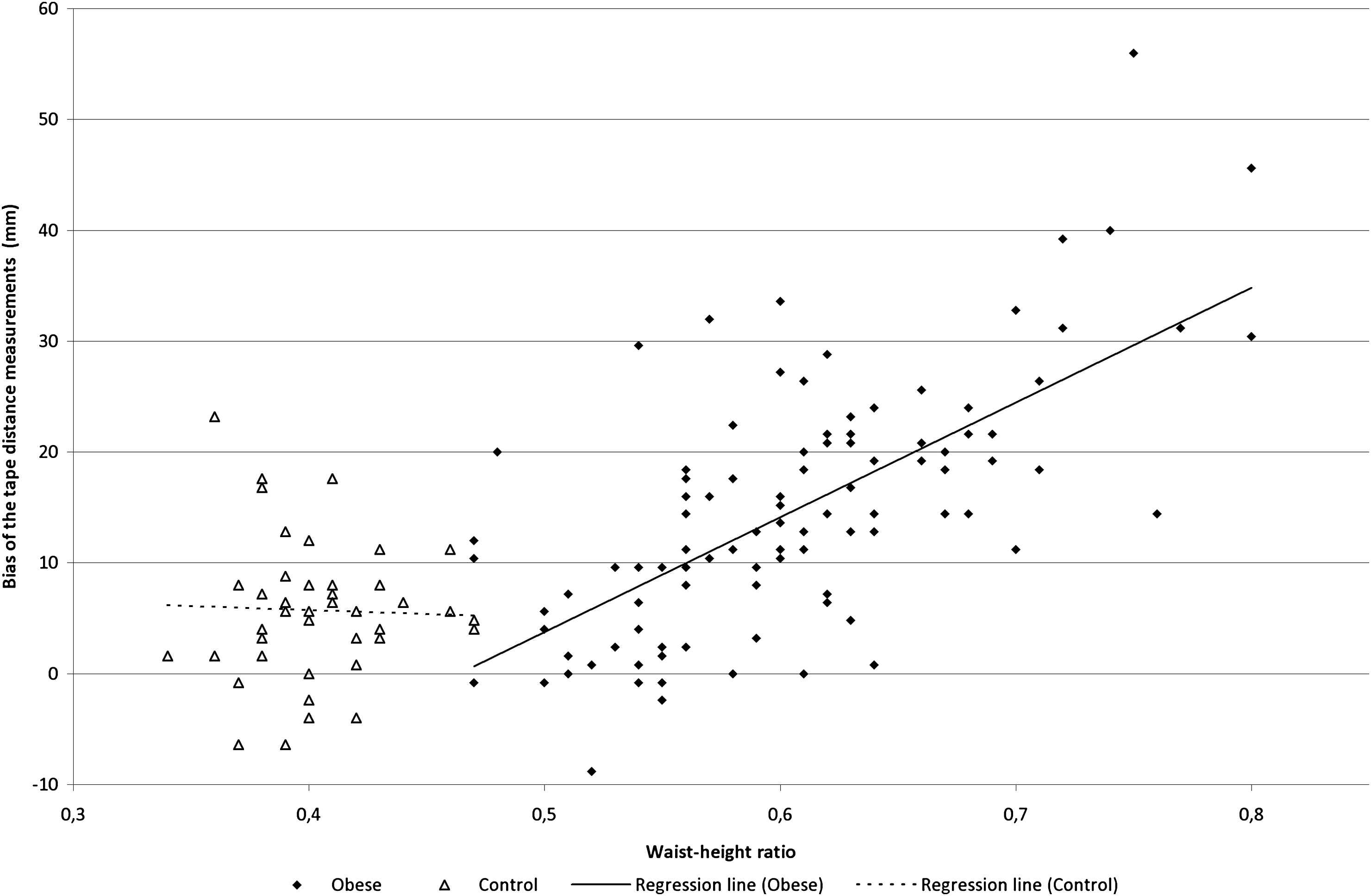Although no significant differences in the distance measures were found between the obese and the control group, the bias of the tape distance measurements (mean ± SD) were significant in both the obese (Δ 14.6 mm ± 11.2 mm, P < 0.0001) and the control group (Δ 5.7 mm ± 5.8 mm, P < 0.0001). Also, a linear relationship was found between the bias of the tape measurements and waist-height ratio in the obese group, while no relation was found for the control group (Fig. 1).