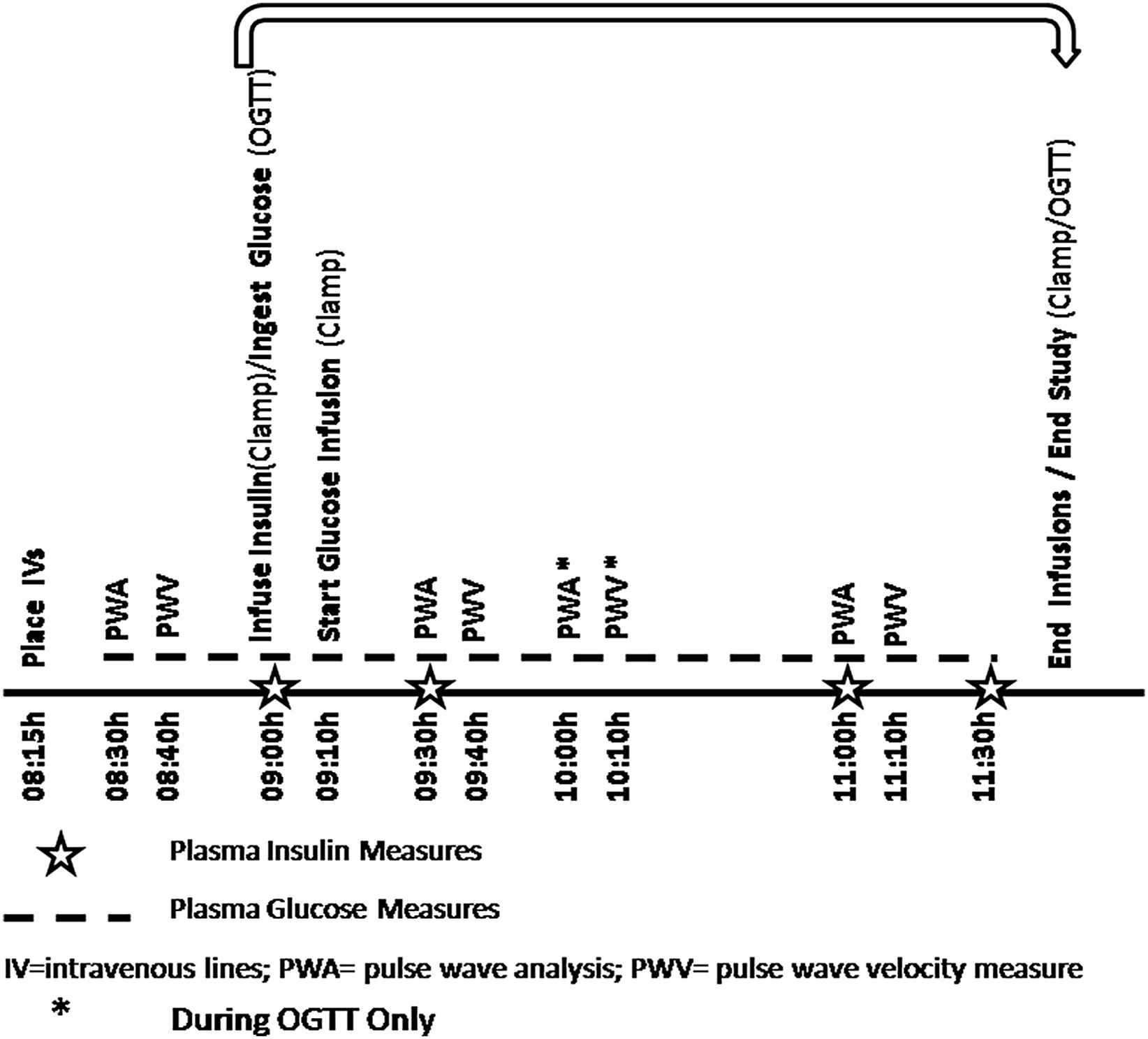 The participant was readmitted approximately 1–4 weeks later (women were studied at a similar menstrual phase). The participant arrived at the GCRC at 1700 h. A standard meal was served at 1800 h with a snack at 2000 h and then the participant fasted overnight, except for water. The following morning an IV was placed in the hand only, at 0815 h. The participant rested for 15 min after this, and then underwent the hemodynamic studies as described above at 0830 h. The participant was given 75 g of glucose, and underwent repeat hemodynamic studies at 30 min after the glucose ingestion (0930 h) with repeat values obtained at 1000 h and1100 h (total of 4 measurements). Samples of glucose and insulin were obtained as per Fig. 1. The timing of the hemodynamic measures was set to capture maximum insulin effect (typically at 30–60 min) as seen in prior studies, thus, the extra vascular measurements at 60 min during the OGTT procedure.