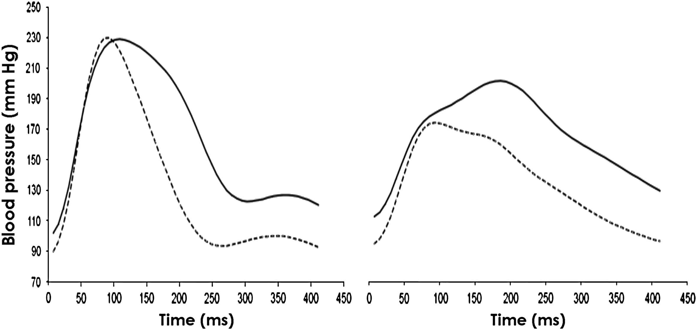 Example maximal exercise radial (left panel) and estimated central (right panel) pressure waveforms from two middle-aged men with a hypertensive response to exercise and similar brachial systolic blood pressures (229 and 230 mm Hg). However, one subject has central systolic blood pressure 27 mm Hg higher (198 mm Hg; solid lines) than the other (171 mm Hg; dotted lines).