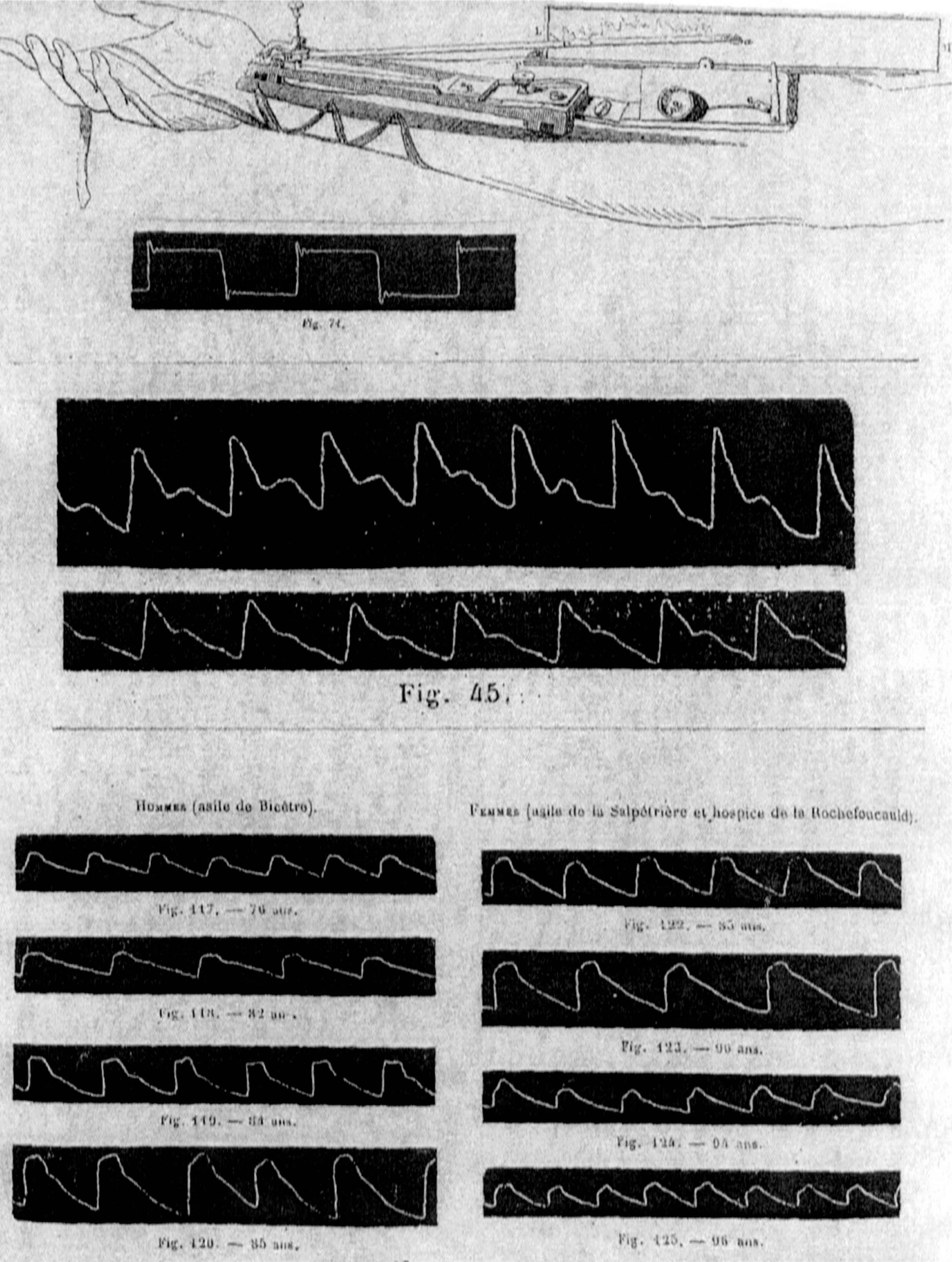 Illustrations from Marey’s (1863) original publication on the sphygmogram. Top: The original instrument, with base-plate applied over the radial artery, with long stylus, pivoting near the site of recording, drawing an amplified signal on smoked paper which was moved by a clockwork mechanism. Inset below is a ‘square wave’ test to establish frequency response and instrument artefact. Center: Sphygmogram tracings in two young adults, showing typical young radial patterns. Bottom: Sphygmogram tracings in old men (left) and women (right), showing typical patterns of senescence. From Nichols and O’Rourke (2005) [5].