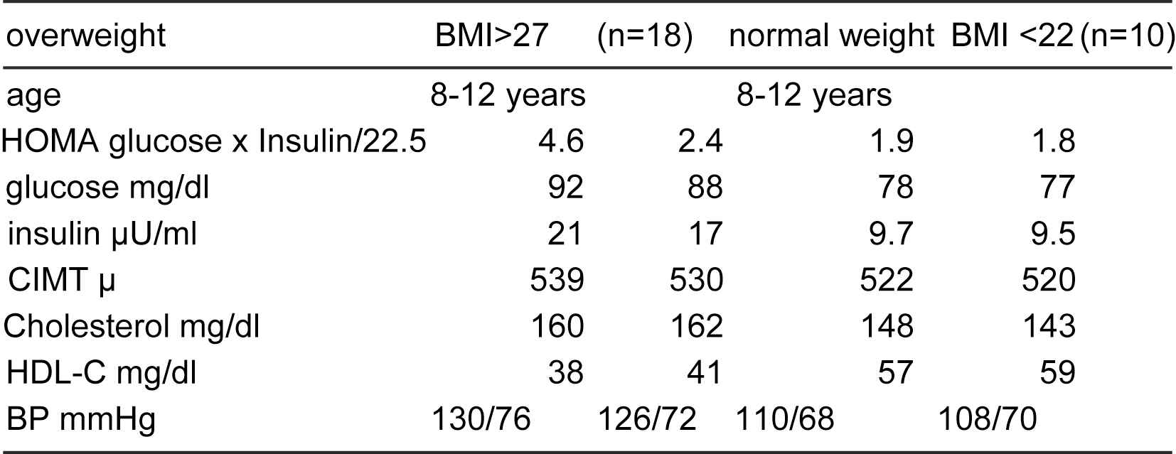 Discussion: Both groups lost some weight and showed an improvement in different parameters. The relative change in CIMT was significantly more in the obese group A positive correlation between HOMA and CIMT was observed, (r= 0.717, p< 0.02). in the overweight cases increasing significantly (r=0.832, p<0.01) (delta change p<0.05).