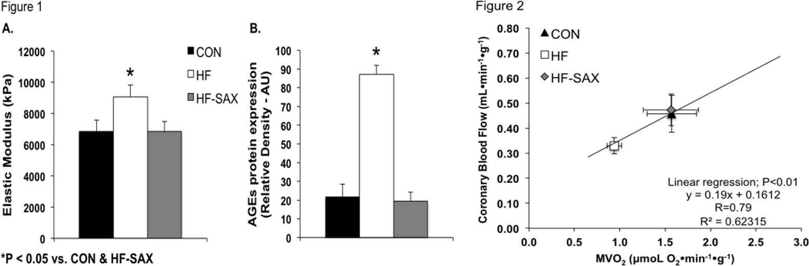 Results: A significant increase in the elastic modulus of the RCA and LCX in HF animals was associated with increased vascular medial AGEs protein expression compared to CON. Increased mechanical stiffness and AGEs expression was prevented in HF-SAX animals. Increased AGEs expression in the HF group occurred independent of changes in plasma glucose concentration. Parallel trends in the mRNA expression of several extracellular matrix components and regulatory biomarkers were observed in HF animals, including increased collagen I/III, TIMP-1, and decreased MMP-9. Increased mechanical stiffness in HF animals was associated with a leftward shift in the CBF:MVO2 relationship that was prevented by saxagliptin.