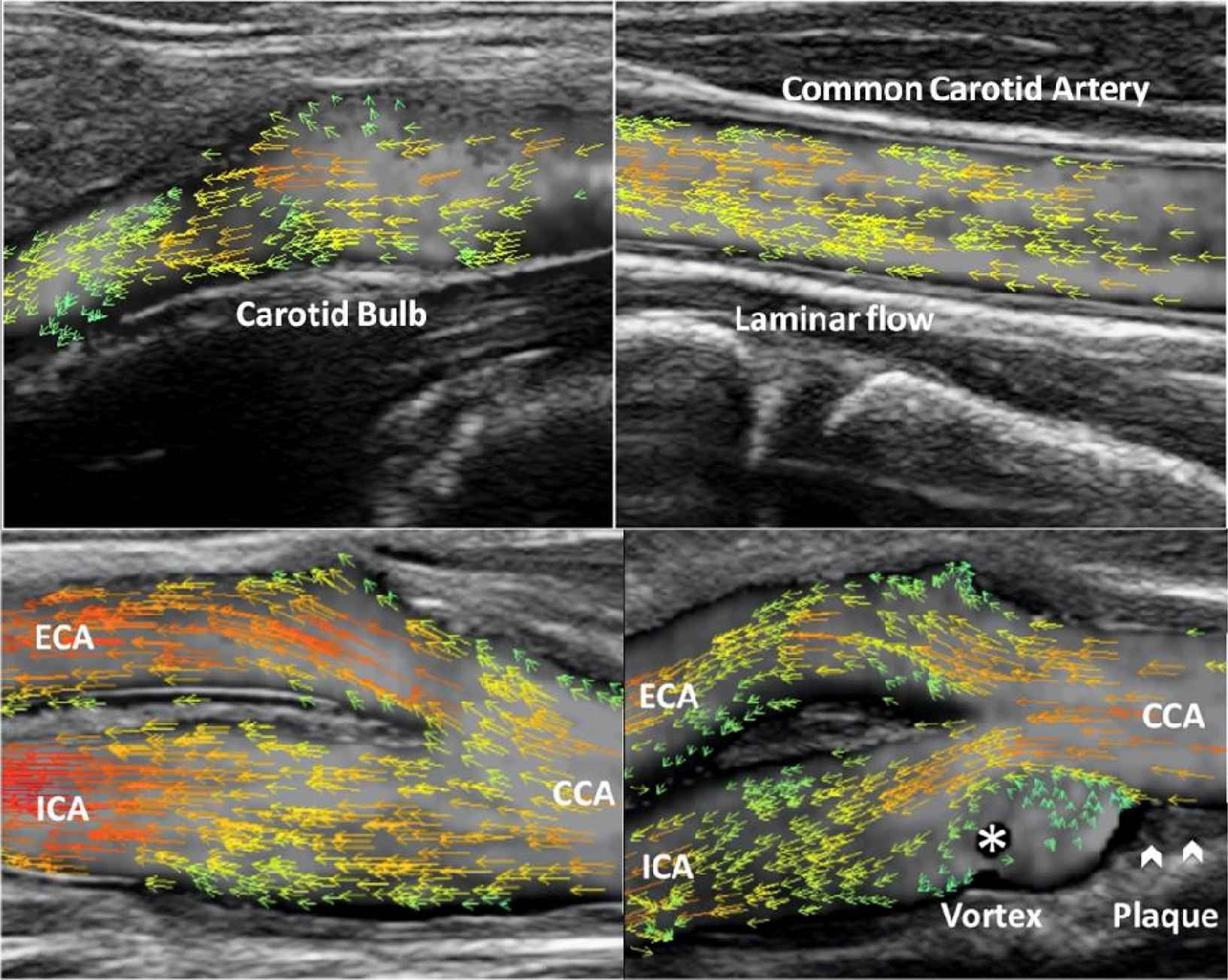 Hemodynamics becomes extremely complicated when plaques develop in the carotid bulb. The dynamic display with velocity vectors assesses flow patterns, e.g. laminar flow, vortex and turbulence (Examples are shown in the figure). The circular variance for the angles of vectors in a desired region of interest can be calculated, allowing disturbance quantification for the non-laminar flow. The method is capable of measuring volume flow (VF) and wall shear stress (WSS) at different locations. To ensure the accuracy both VF and WSS are calculated based on a frame rate of 400–600 Hz and vector velocities.