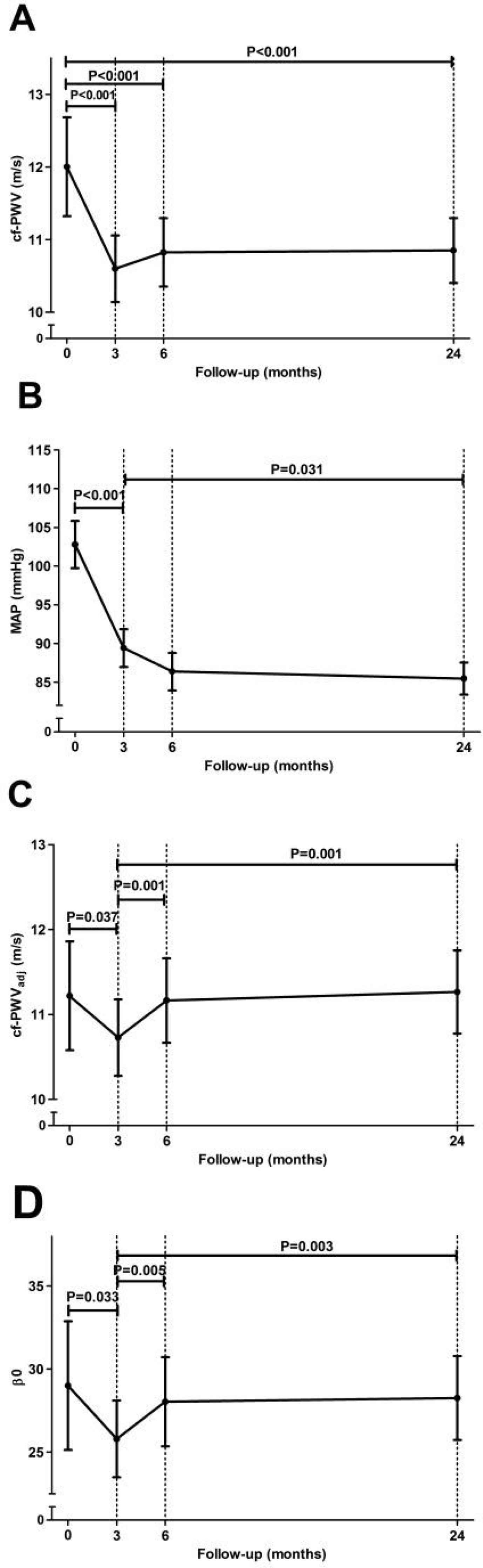 Results: There was a reduction of β0 3 months after KTx (29.0±2.0 to 25.8±1.2, P = 0.033). Then, aortic stiffness index β0 gradually increased at 6 (28.0±1.4, P = 0.005 vs 3 months) and 24 months (28.3±1.3, P = 0.003 vs 3 months). Unfavourable progression of β0 was not related to renal function, age, comorbidities or kidney donor characteristics. However, the unfavourable progression of β0 was associated with higher levels of interleukin-6 (P = 0.029).