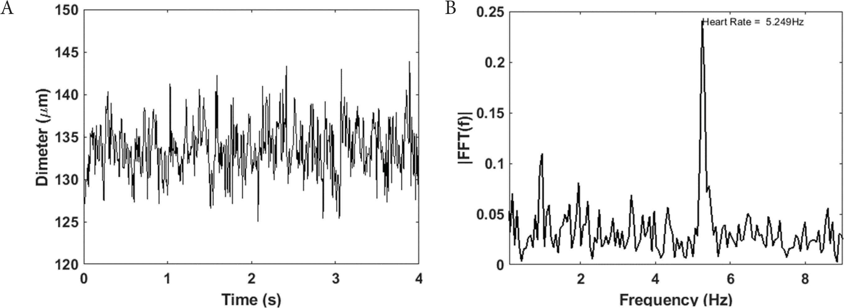 Figure 1A shows a representative retinal arterial diameter waveform. Although a clear cardiac related waveform is not visually apparent, the diameter signal exhibits power at the cardiac frequency (Figure 1B).