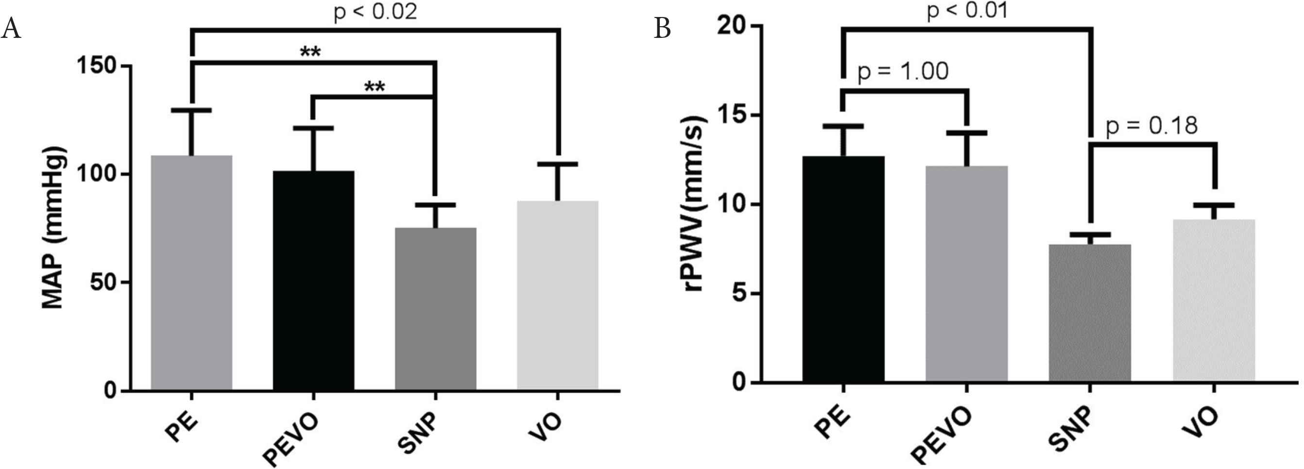 Average (A) mean arterial pressure (MAP) and (B) retinal artery pulse wave velocity (rPWV) following infusion of phenylephrine (PE), sodium nitroprusside (SNP) and the use of venous occlusion (VO) as means of manipulating blood pressure; **p < 0.01
