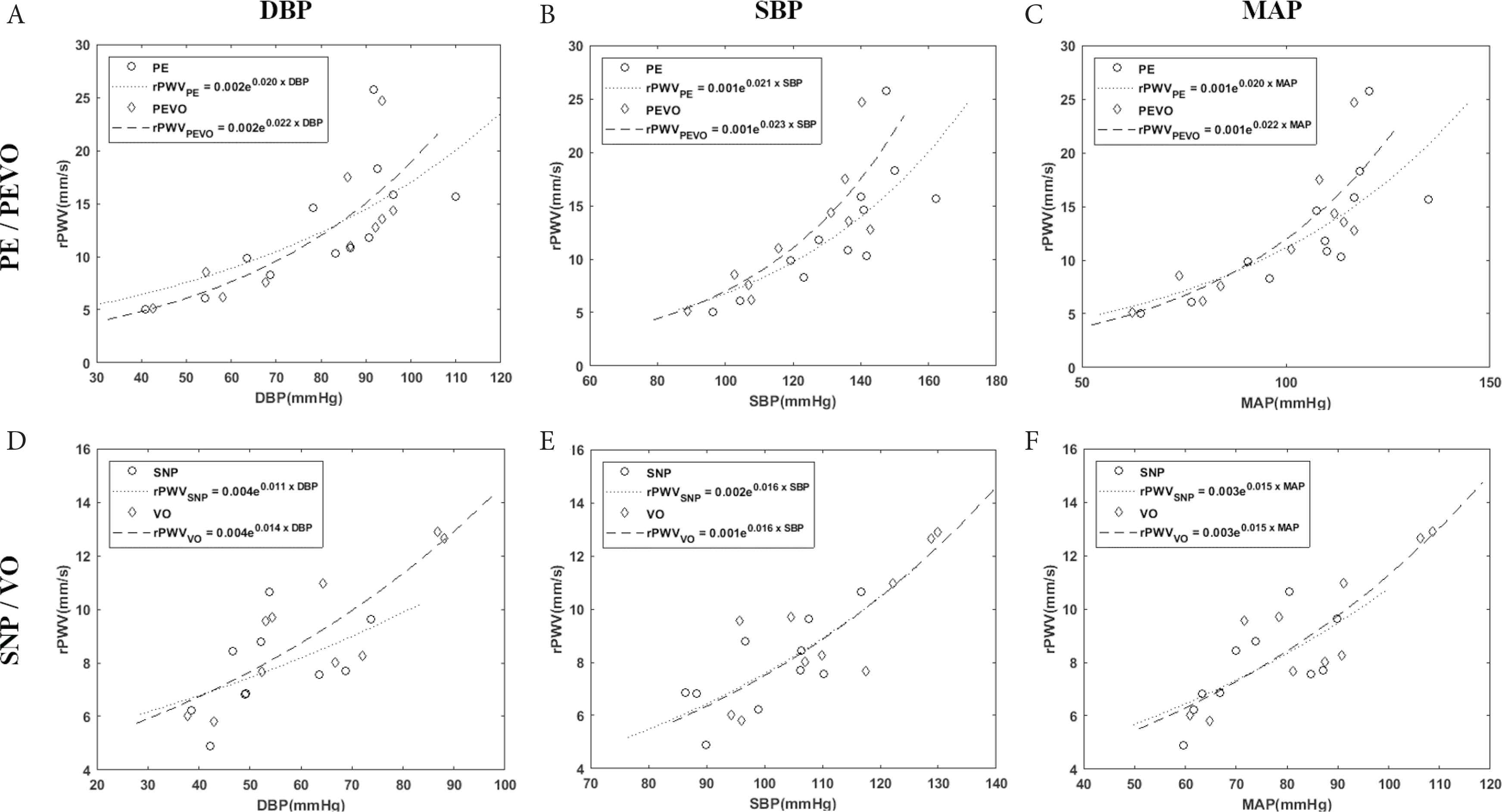 Retinal artery pulse wave velocity (rPWV) regression against diastolic (DBP), systolic (SBP), and mean arterial blood pressure (MAP) comparing blood pressure achieved by either (A–C) phenylephrine infusion (PE) or phenylephrine infusion during venous occlusion (PEVO), or (D–F) sodium nitroprusside infusion (SNP) or venous occlusion (VO)
