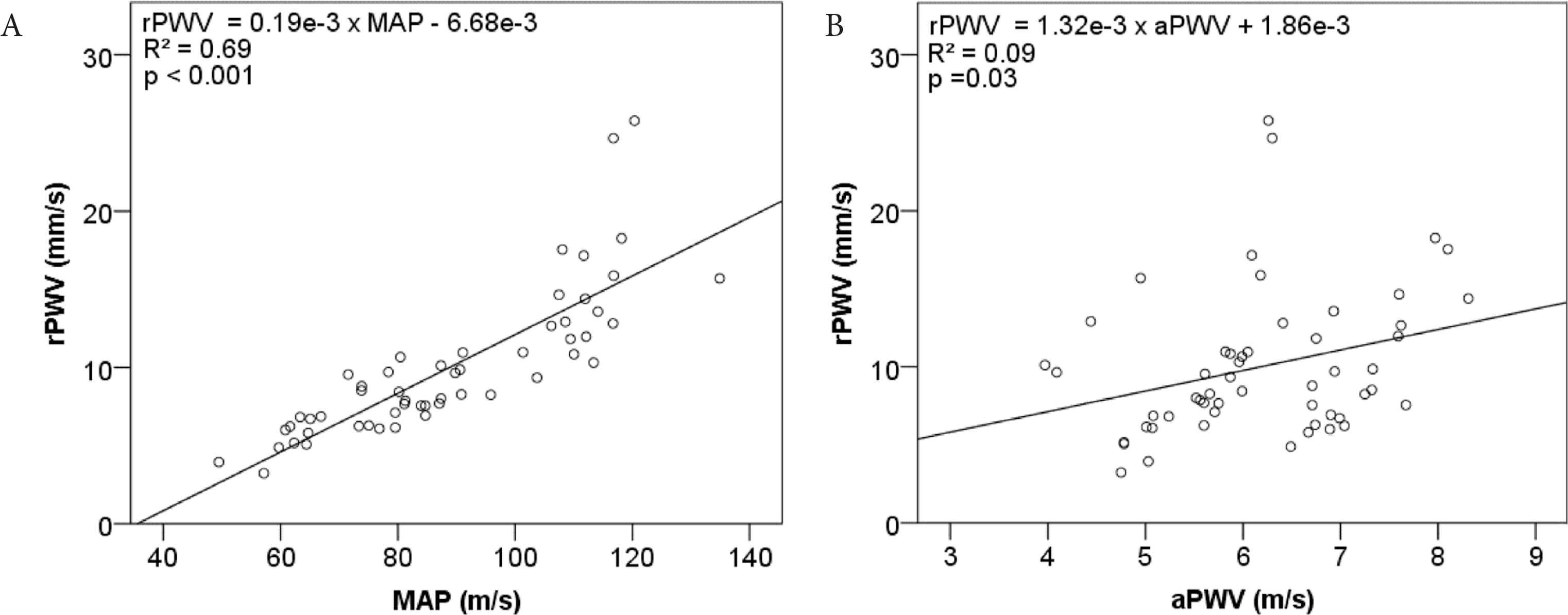 Linear regression of retinal artery pulse wave velocity (rPWV) against (A) mean arterial pressure (MAP), and (B) aortic pulse wave velocity (aPWV)