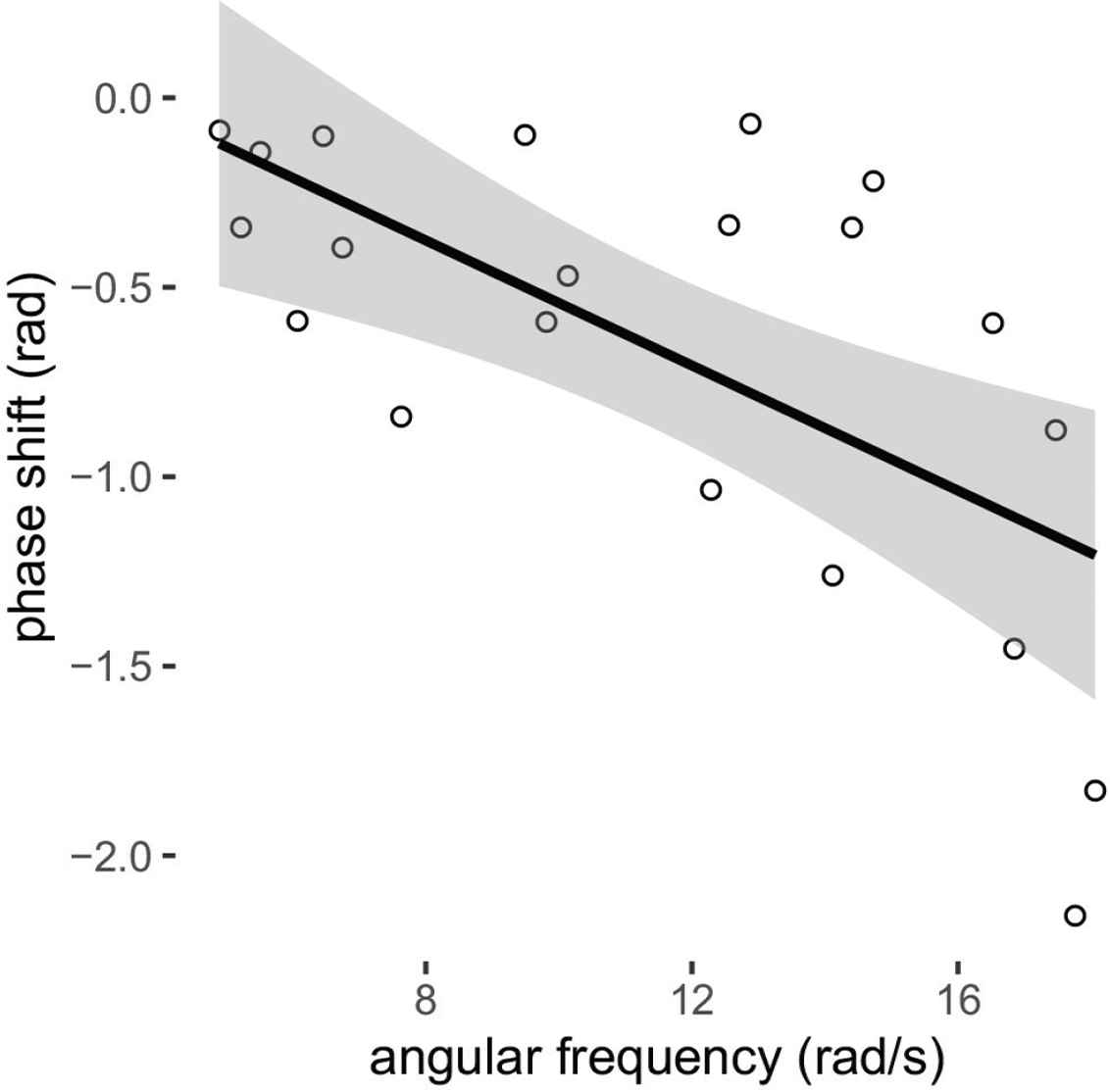 Example of calculation of PTT as the slope of the regression line of phase shifts on the angular frequency. For this example, phase shift = −0.083 × angular frequency + 0.29 (transit time of 83 ms).