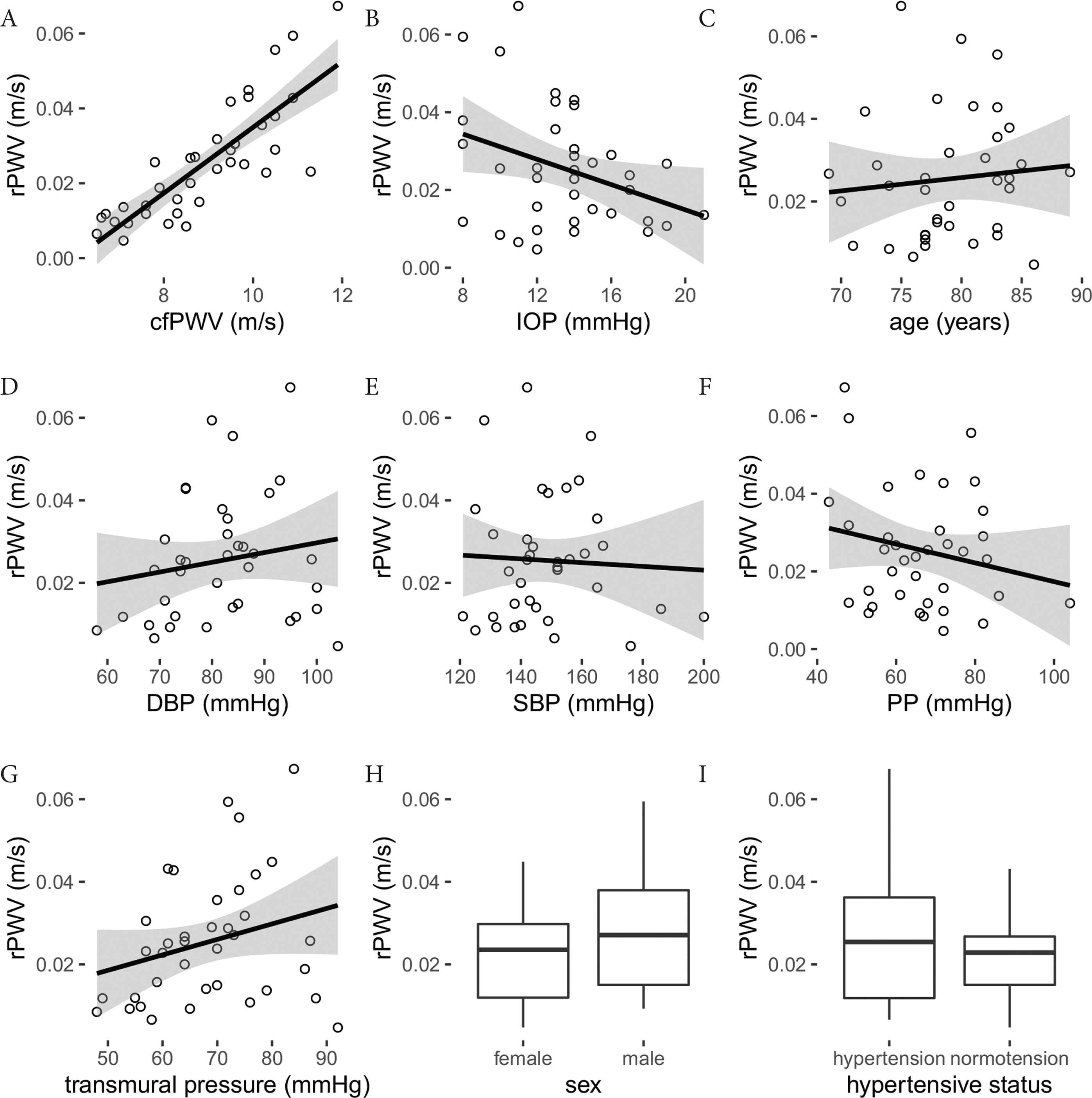 (A–G) Linear regression between rPWV and measured continuous variables. Regression equations provided in Table 2. (H) rPWV grouped by sex (p = 0.50) and (I) hypertensive status (p = 0.56).