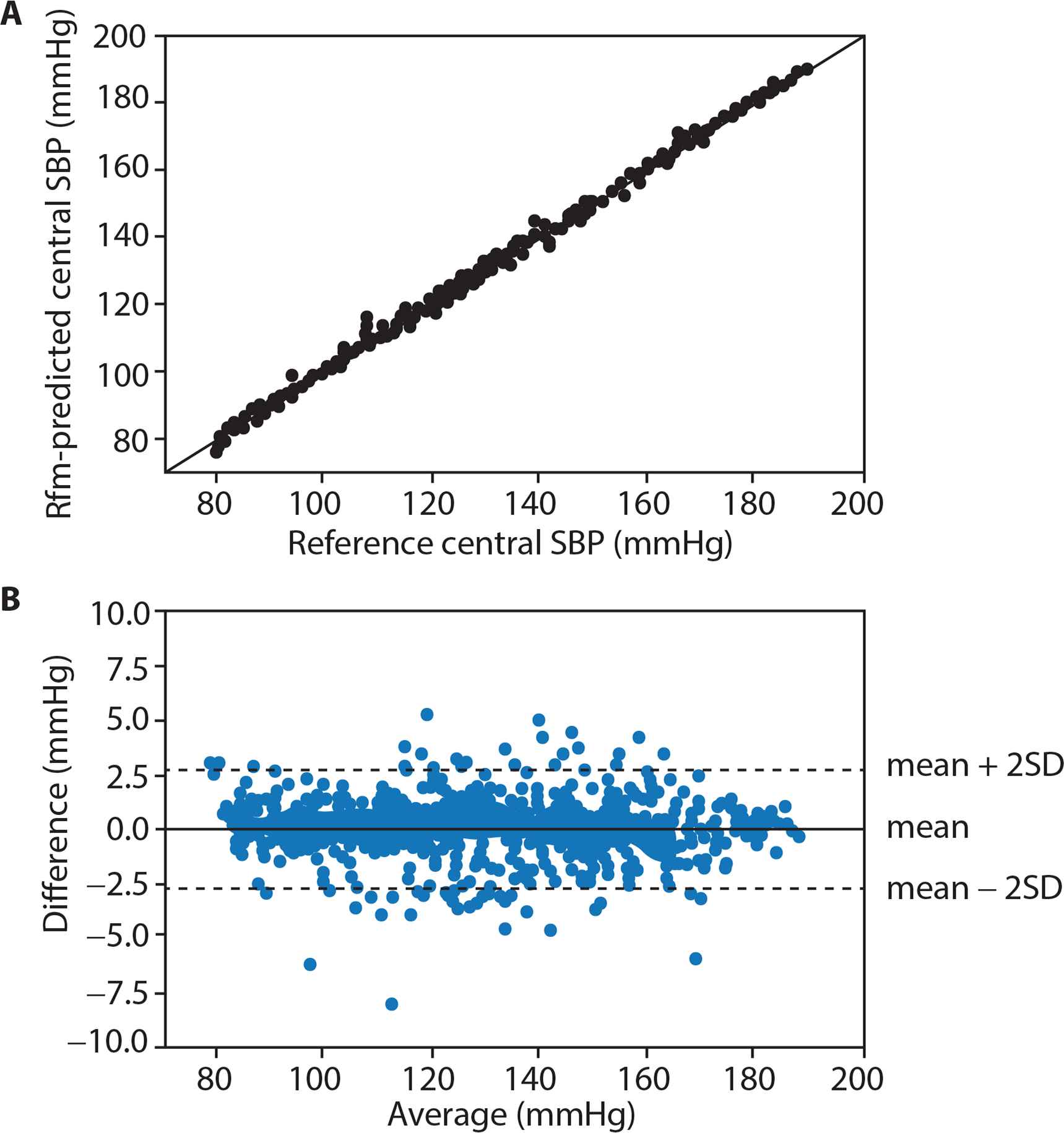 Results: Our results demonstrated that precise estimates of CO and cSBP were yielded with an RMSE of 0.39 L/min and 1.39 mmHg, respectively (Figures 2 and 3). Low biases were observed, namely 0.03 ± 0.39 L/min for CO and −0.08 ± 1.39 mmHg for cSBP. PWV, HR, and brachial pulse pressure were found to be the most correlated features with CO, whereas brachial SBP was plausibly shown to be the significant determinant of cSBP for our model (Figures 4 and 5).