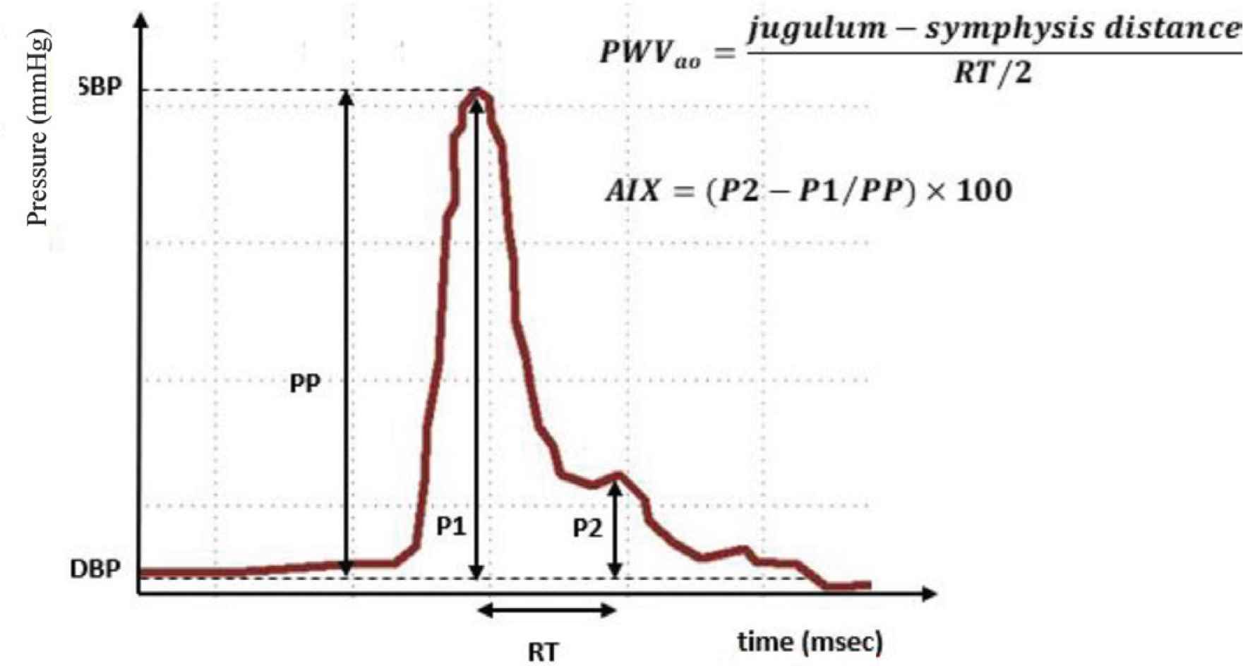 Calculation methods of pulse wave value and augmentation index from the pulse pressure waveform. P1, Amplitude of the forward pressure waveform minus diastolic blood pressure value; P2, Amplitude of the backward pressure waveform minus diastolic blood pressure value; RT, Return time; PP, pulse pressure.
