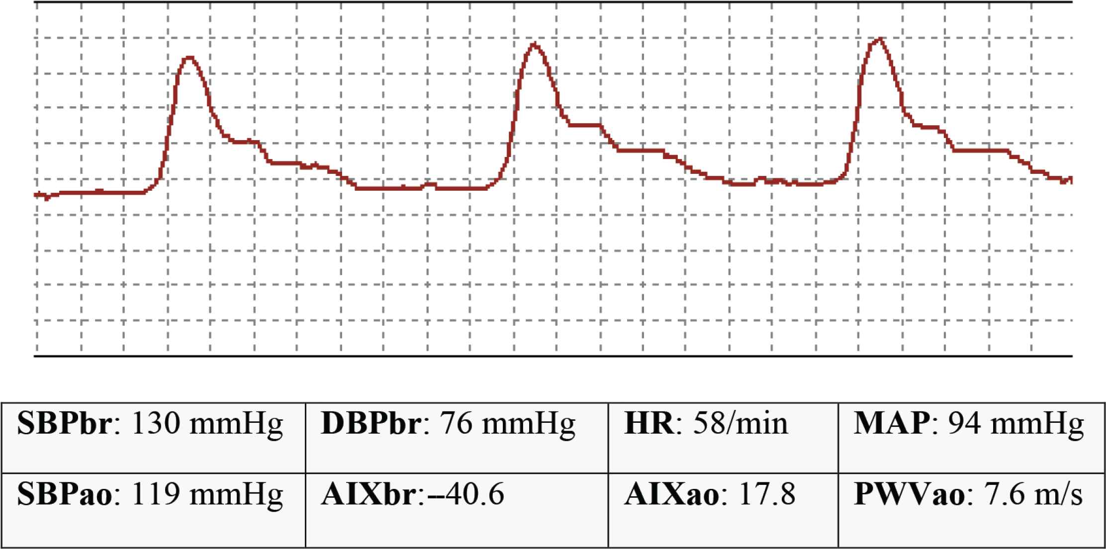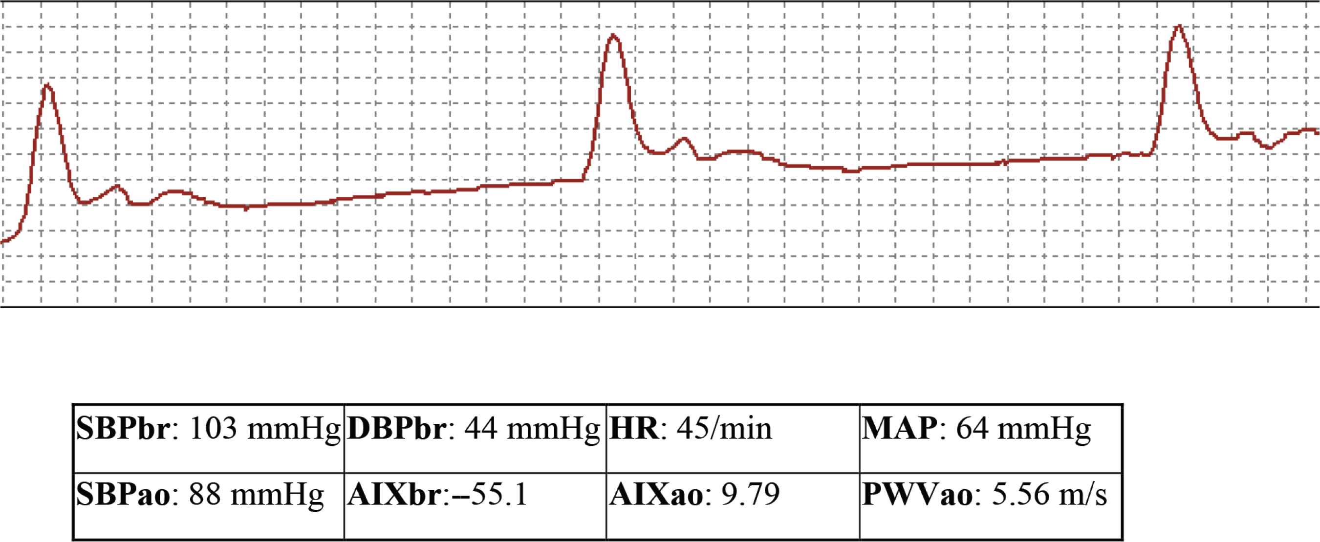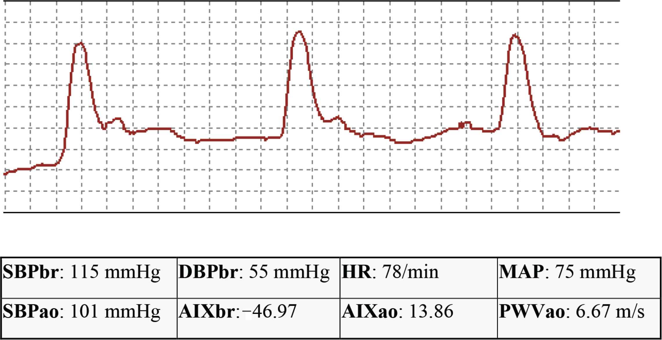 Original pulse pressure waveform of a negative control. SBPbr, brachial systolic blood pressure; DBPbr, brachial diastolic blood pressure; HR, heart rate; MAP, mean arterial pressure; PP, pulse pressure; SBPao, central systolic blood pressure; AIxao, central augmentation index; AIxbr, brachial augmentation index; PWV, pulse wave velocity.