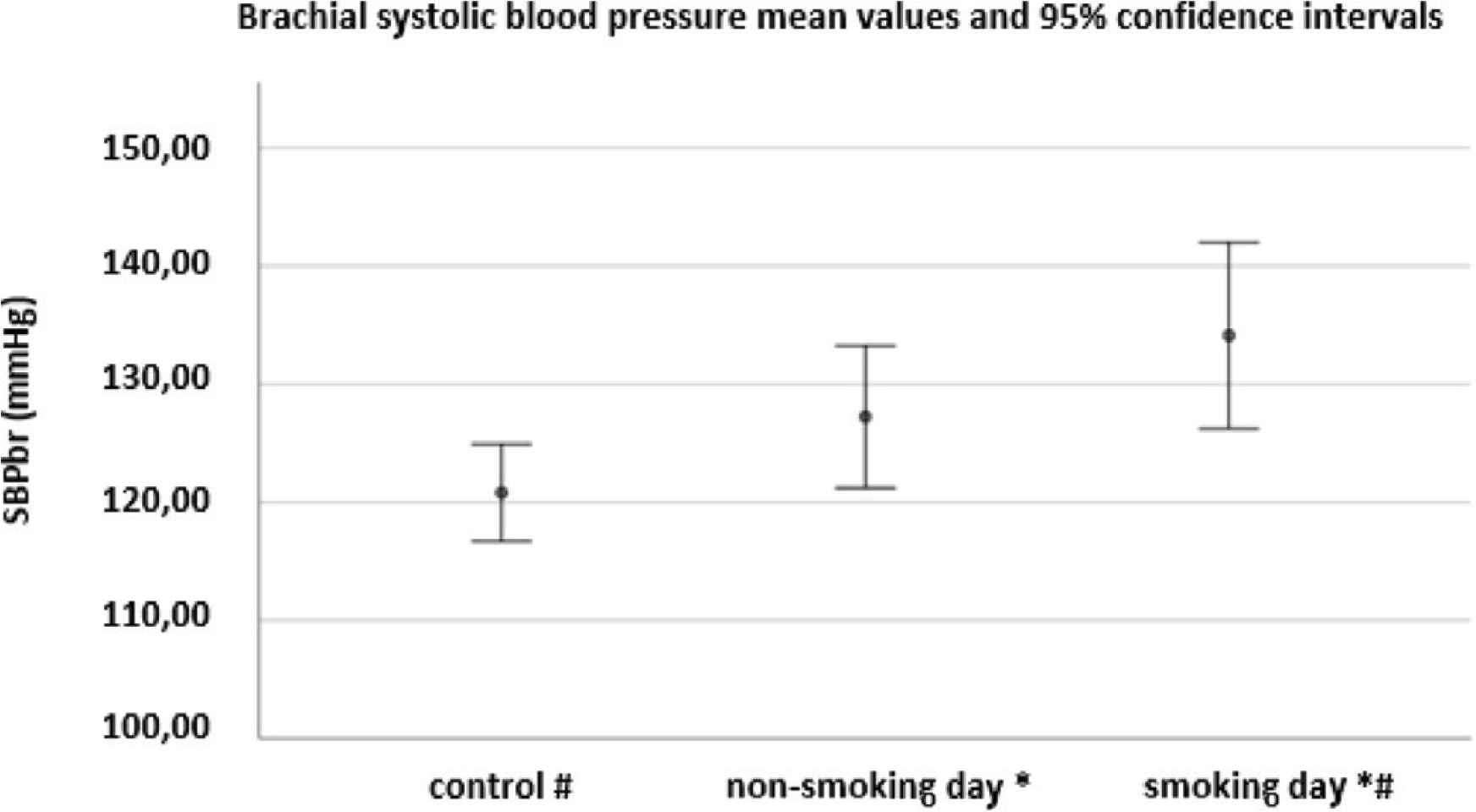 Brachial systolic blood pressure mean values and 95% confidence intervals among non-smokers, among smokers on the non-smoking day and among smokers on the smoking day. *Significant difference between smokers on the smoking day and on the non-smoking day (p = 0.02). #Significant difference between smokers on the smoking day and non-smokers (p = 0.005). SBPbr: brachial systolic blood pressure.