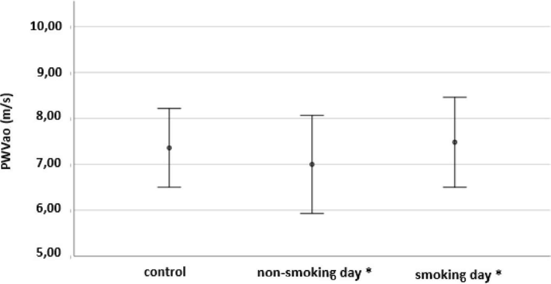 Pulse wave velocity mean values and 95% confidence intervals among non-smokers, among smokers on the non-smoking day and among smokers on the smoking day. *Significant difference between smokers on the smoking day and on the non-smoking day (p = 0.03). PWVao: central pulse wave velocity.