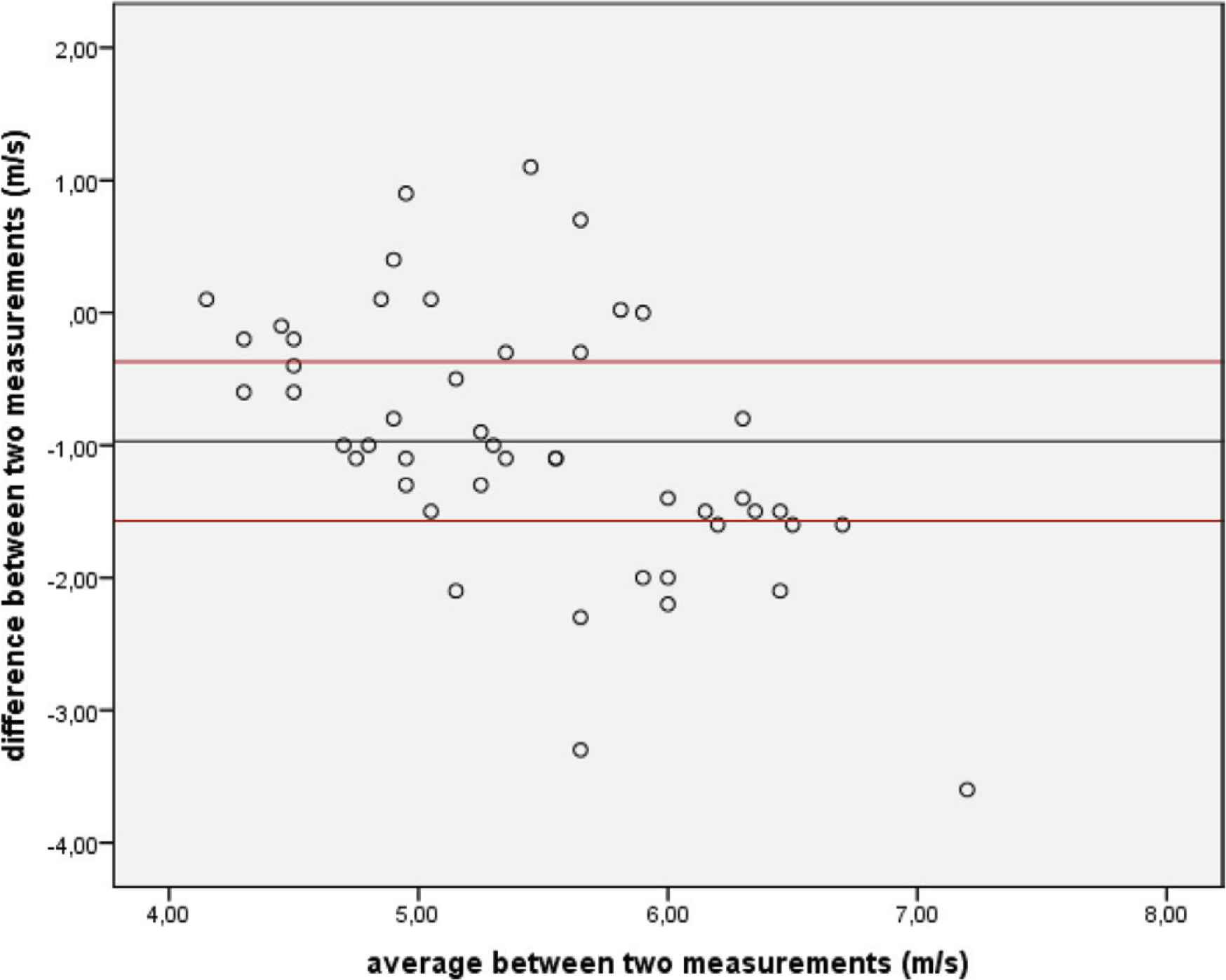 Bland and Altman plot for pulse wave velocity measurement performed carotid-radial lying and carotid-radial sitting.