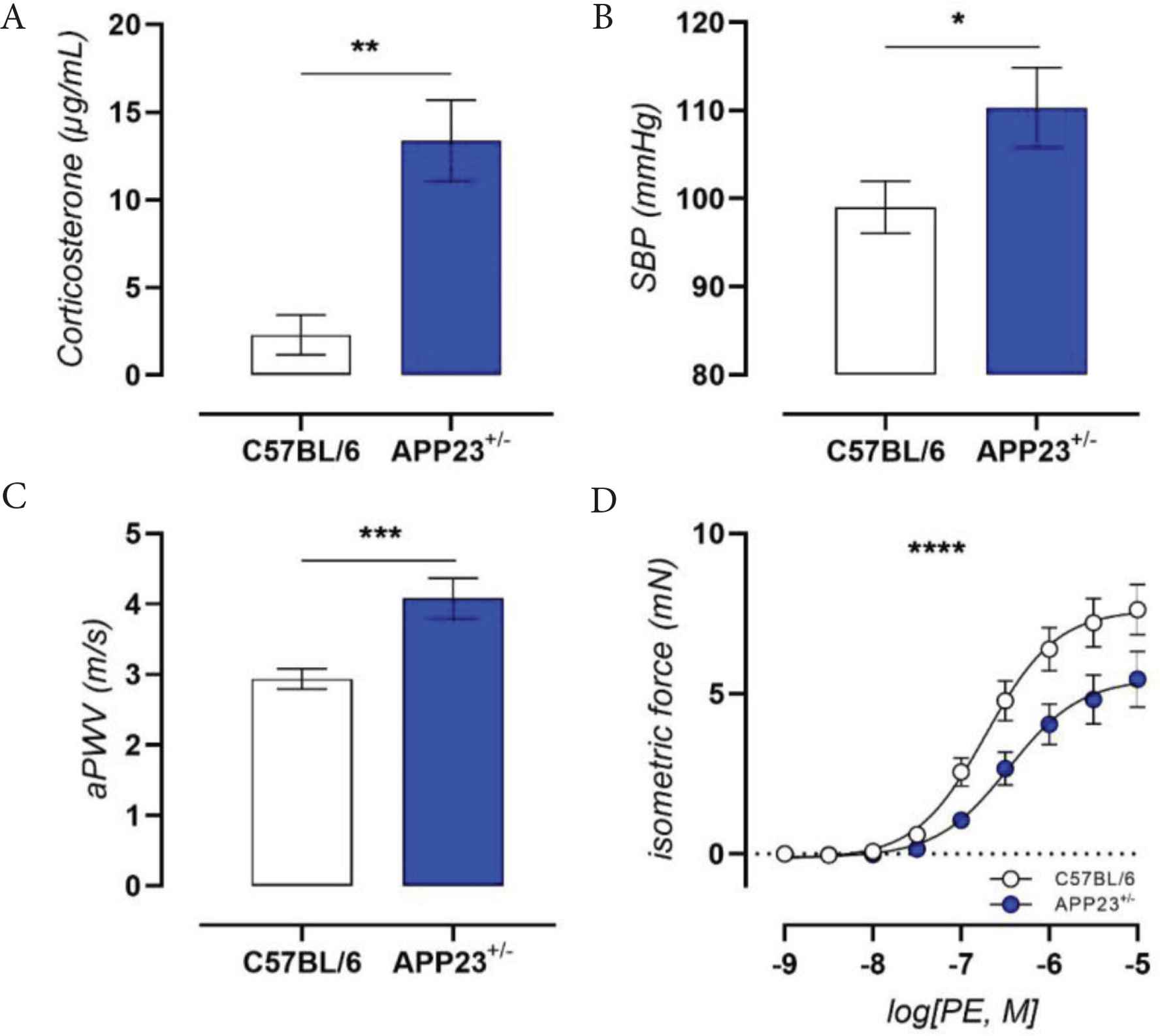 Methods: Blood pressure (BP, CODA) and aortic pulse wave velocity (aPWV, VEVO2100) were measured in vivo, whereas isometric vascular reactivity (organ chambers), isobaric AS (Peterson modulus (Ep)) and compliance (Rodent Oscillatory Tension Set-up for Arterial Compliance) were determined ex vivo in thoracic aorta segments of APP23+/− mice (male, n = 10) vs. C57BL/6 mice (male, n = 18) at the age of 6 months. Corticosterone levels were analysed on blood serum by means of ELISA. The data are given as mean ± SEM.