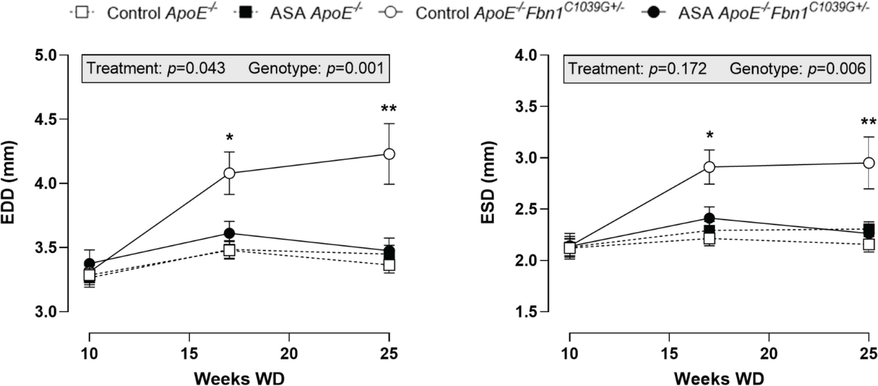 Methods: Female ApoE−/− and ApoE−/−Fbn1C1039G+/− mice were fed a Western diet (WD). At 10 weeks WD, the mice were divided in 2 groups receiving ASA (5 mg/kg/day) via the drinking water or plain water (control) for a period of 15 weeks. Echocardiograms were performed at 10, 17 and 25 weeks WD. At the end, blood pressure was measured via tail-cuff and blood samples were taken. The aorta and heart were collected for histology.