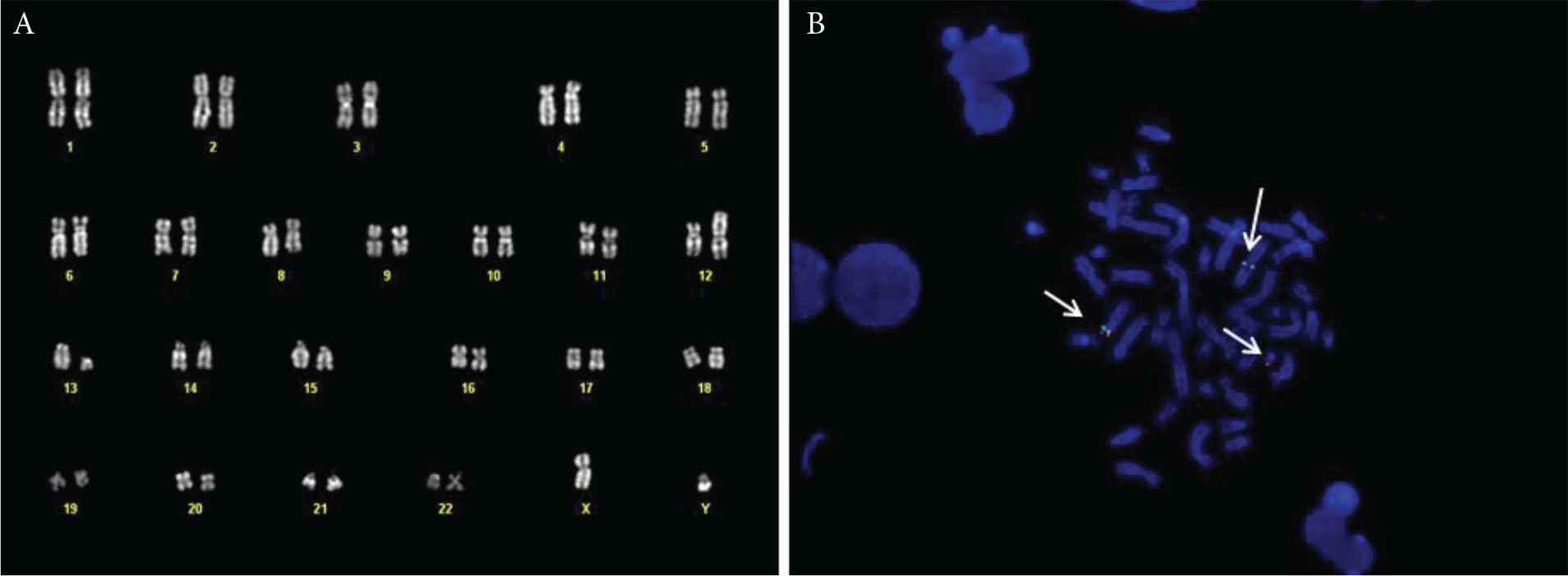 (A) Bone marrow karyotype of the patient, showing the t(12;13) translocation. (B) Fluorescent in situ hybridisation (FISH) with the ETV6 break-apart probe, showing the normal chromosome 12 (green and red signal), the derivative 12 (green signal) and the derivative 13 (red signal).
