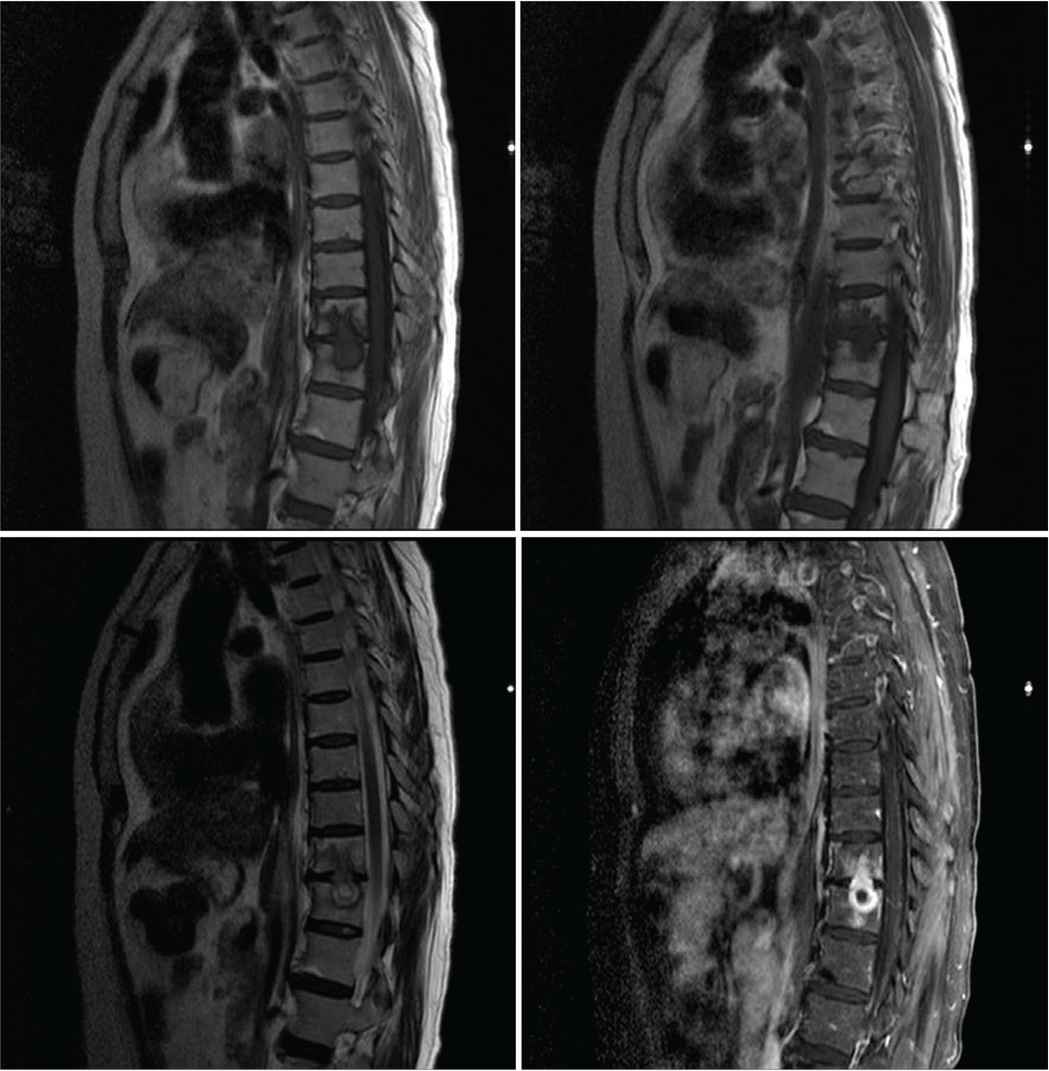 Magnetic Resonance Imaging (MRI) scan of the whole spine showing intramedullary dorsal (thoracic) ring-enhancing lesion at the level of T10–T11.
