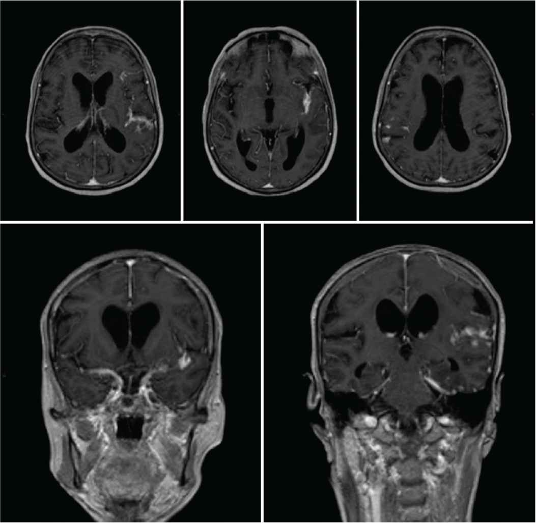 Magnetic Resonance Imaging (MRI) scan of the brain showing diffuse meningeal enhancement with no intraparenchymal cerebral or cerebellar lesions.