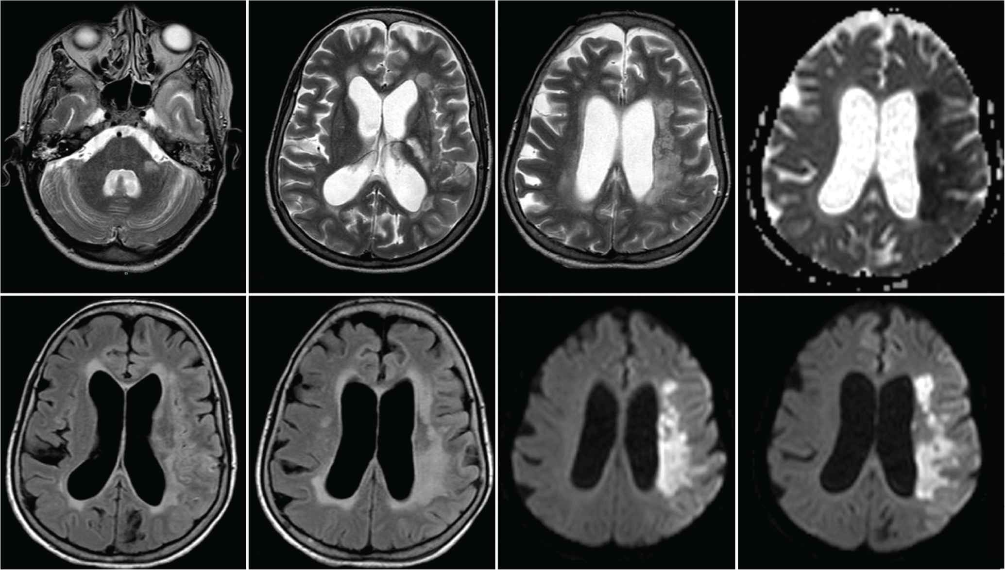 Magnetic Resonance Imaging (MRI) scan of the brain showing an acute ischemic infarction with restricted left capsular, medial temporal, and hippocampal lesions in the apparent diffusion coefficient map.