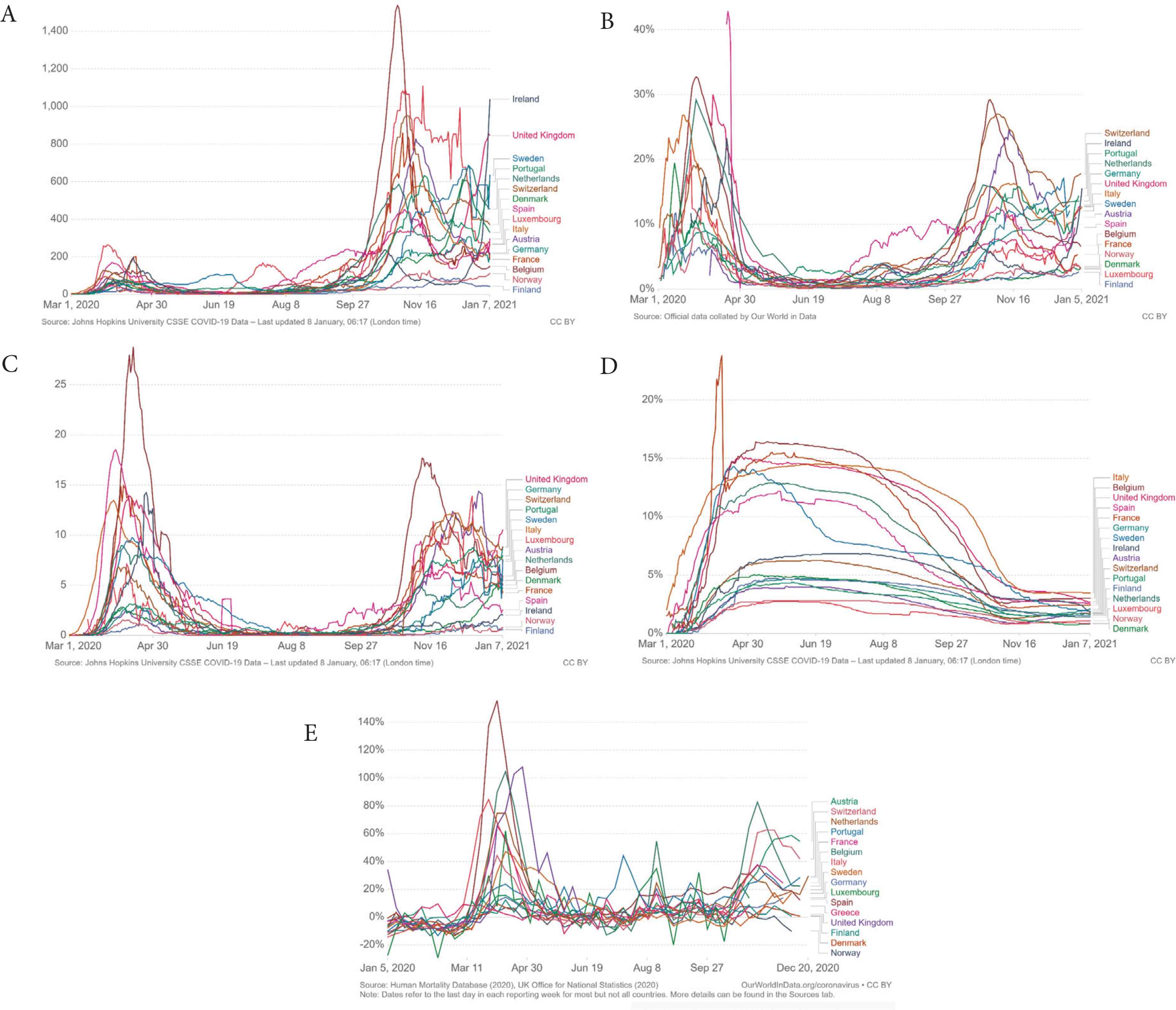Seven-day rolling averages of severe acute respiratory syndrome coronavirus 2 (SARS-CoV-2) new cases (A), positive rate in the tests (B), new deaths (C), and case fatality rate (D) plus excess mortality (E) in countries of Western Europe. Images from ourworldindata.org. CC BY.