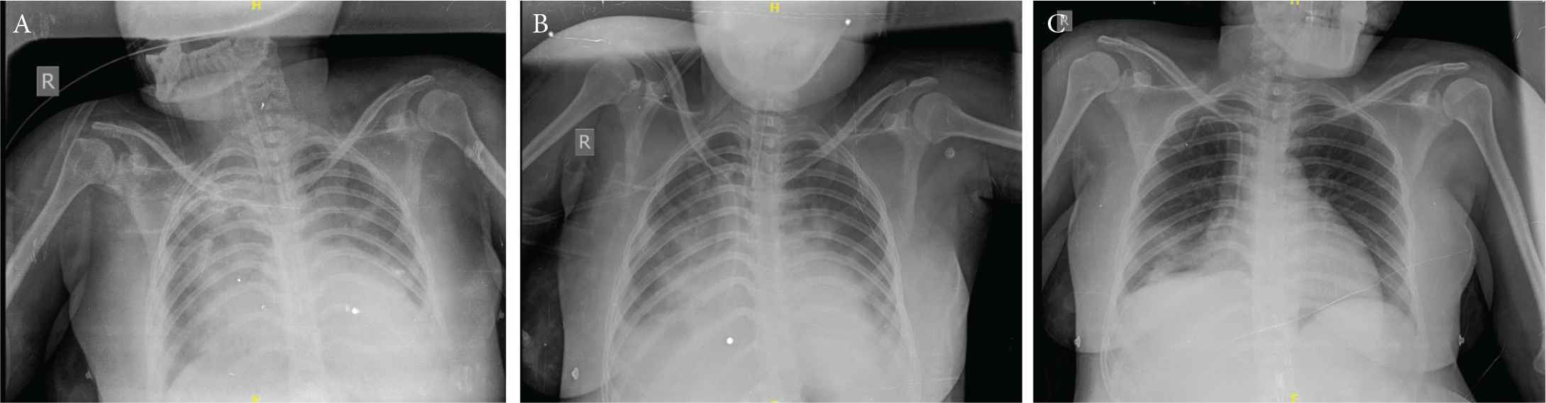 (A) X-ray chest P/A day of admission shows ground glass appearance and early pneumonitis changes suggestive of pulmonary oedema and aspiration. (B) X-ray chest P/A; day 3 shows patches of lower lobe pneumonia right lung (following aspiration). (C) X-ray chest P/A; day 6 normal lungs.