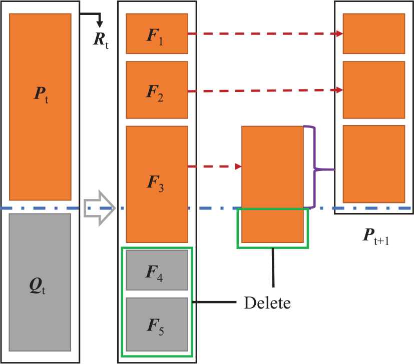 According to the nondominated sorting strategy of NSGA-II, the principle is shown in Figure 1. Suppose that the population size is N, and Population Rt (the population size is 2N) is combined by the current dominated solution set Pt and the current offspring Qt. According to the dominance relation, Rt gets a series of nondominated Pareto solution set, with the order of F1, F2, …. F1 is in the top level. If the quantity of F1 is less than N, all members of F1 will be selected into Population Pt + 1. The remaining members in Population Pt + 1 will be selected from F2, F3, … until the quantity of member reaches N. The order of the first member in F3 is less than N, while the order of the last member is greater than N. In order to keep the diversity of the population, NSGA-II algorithm is used to perform C.D. sorting to F3, and the individuals with large C.D. are given priority to entering Population Pt + 1.