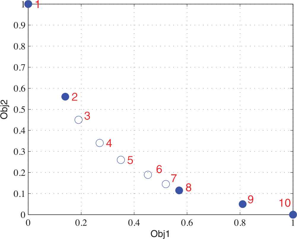 After completing nondominated sorting, the C.D. of each solution within the nondominated solution set at the same level is calculated based on the objective space [2]. The C.D. of the extreme solution (the maximum or minimum solution of all objectives within the objective space) shall be set as infinity all the time (it shall be set as a big real number in the practical operation, such as 1.0e + 50), while other solutions shall be sorted out for all objectives. The C.D. of other solutions shall be defined as the average value of target distances between two adjacent solutions. Among 10 nondominated solutions as shown in Figure 2, five solutions has been selected in accordance with the C.D. According to the C.D. sorting algorithm of NSGA-II, the C.D. for all solutions are listed in Table 1. In which: The C.D. of Solutions 1–2 and 8–10 are so large that all of them shall be kept, while the C.D. of Solutions 3–7 is too small to be saved. As shown in Figure 3, after the selection, the results of Solutions 2 and 8 are not reasonable due to the sparse distance between them.