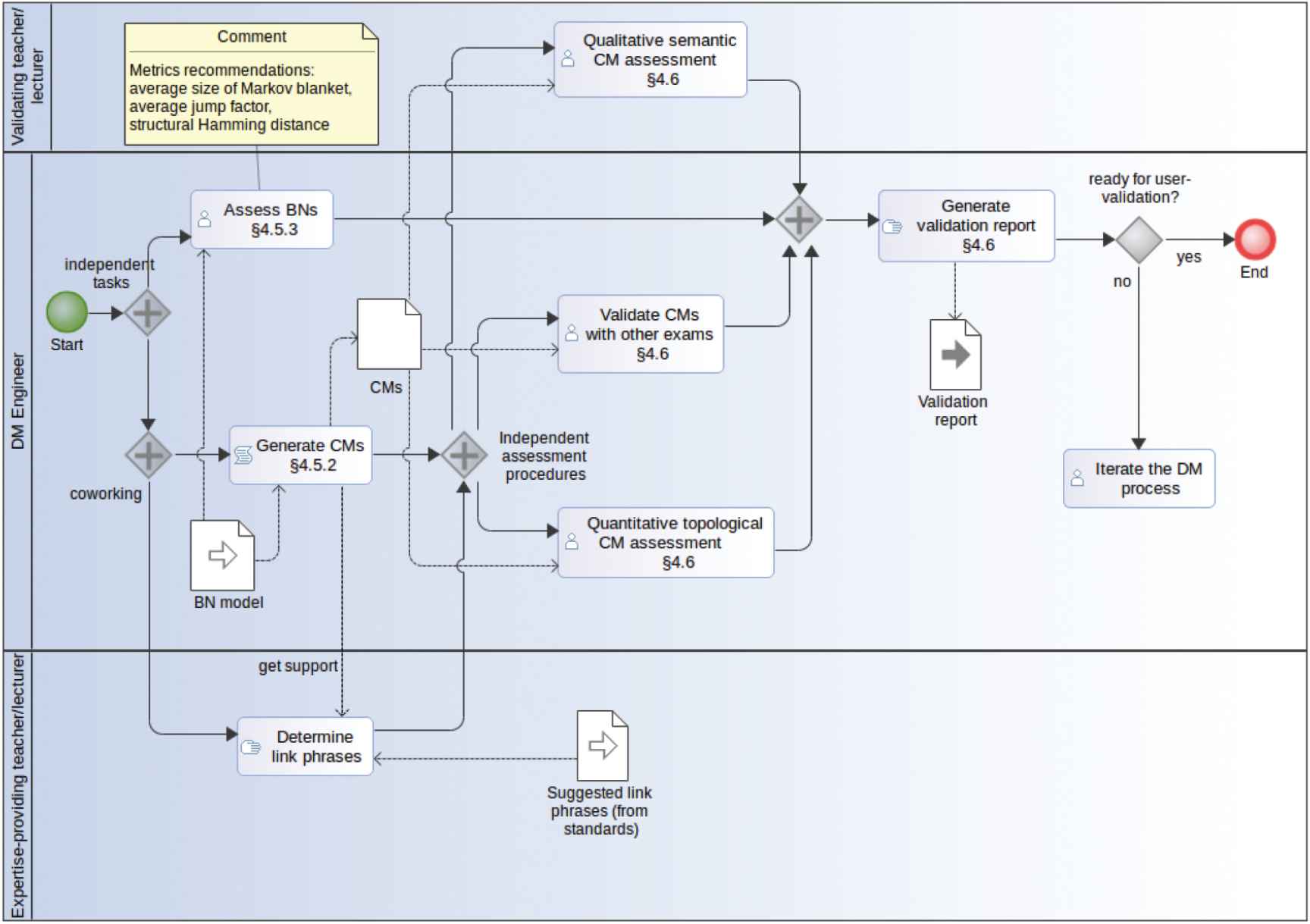 In the course of our experiments (reported on in detail in [51]), we have developed a set of guidelines for the semi-automatic generation of CMs that we consider of sufficient generality to be applied in different learning domains and with different DM techniques. We have also collected expert knowledge in DM that is particularly relevant in this EDM context. We have essentially followed CRISP-DM, a methodology that integrates common approaches to DM problems through six major interdependent phases of a cyclic nature [22]. In this section, we also summarize how we specialized the phases of this methodology to tackle our EDM process and provide a high-level view of our methodology in the form of BPMN [52] process diagrams (see Figures 1–4, where Figures 1 and 2 are generic while Figures 3 and 4 are instantiated for our experimentation with BNs).