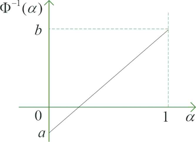 The IUD of linear uncertain variable (LUV) ξ is Φ1(α)=(1α)a+αb (Figure 3). LUD is regular.