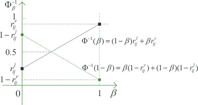 Let X=x1,x2,x3,x4 be the set of alternatives, D=d1,d2,d3 be the set of DMs, R̄t=(r̄ijt)4×4 (i,jN={1,2,3,4}) be the independent UPR of dt (tM={1,2,3}). r¯ijt is a LUV, i.e., r¯ijtL(r¯ijtl,r¯ijtr), with an UD Φijt. Let R¯c=(r¯ijc)4×4 be the collective UPR, r¯ijcL(r¯ijcl,r¯ijcr) be a LUV, and Φijc be its UD function. For any β (β[0,1]), we have Φijc1(β)+Φjic1(1β)=1, and Φiic1(β)=0.5.