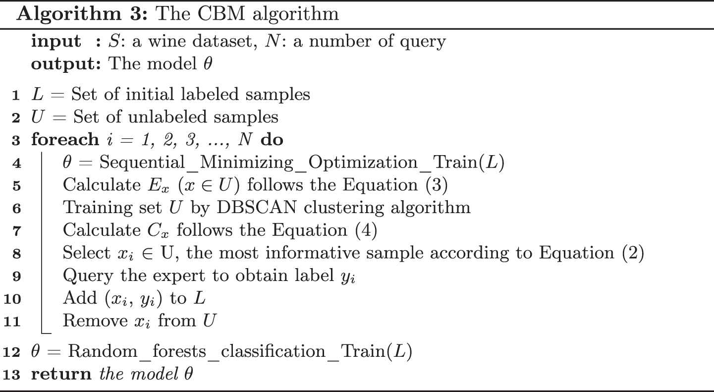 In this section, we propose three algorithms for the wine classification problem. The first algorithm denoted by Uncertainty Model (UCM) uses an uncertainty sampling approach (Algorithm 2), while the second algorithm denoted by Combined Model (CBM) is used for sampling selection (Algorithm 3). The third algorithm called Noisy Model (NSM) is used for dealing with noisy samples (Algorithm 4).