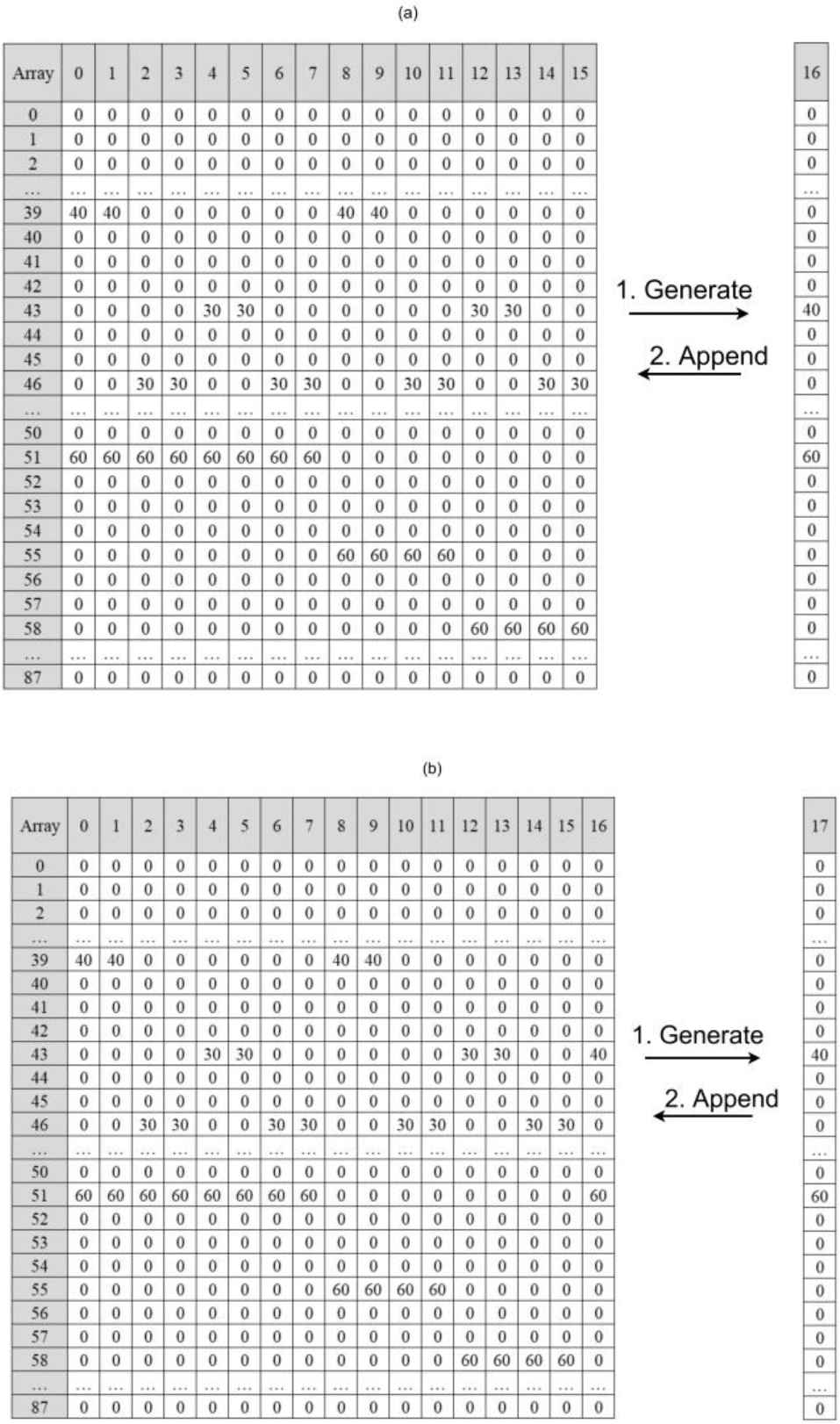 Assume that the sequence length of trained model was 16, then the generating process is shown in Figure 13. The sequence input in Figure 13(a) from vector 0–15 inserted into the model to generate a 1 × 88 array vector as the next vector. Then the generated vector will be appended to the input as vector 16. Then the sequence input is sliding so the vector 1–16 inserted into the model and generate a new vector (shown in Figure 13(b)). This step is looping until 512 new vectors generated. The music is used for the evaluation in the next process.