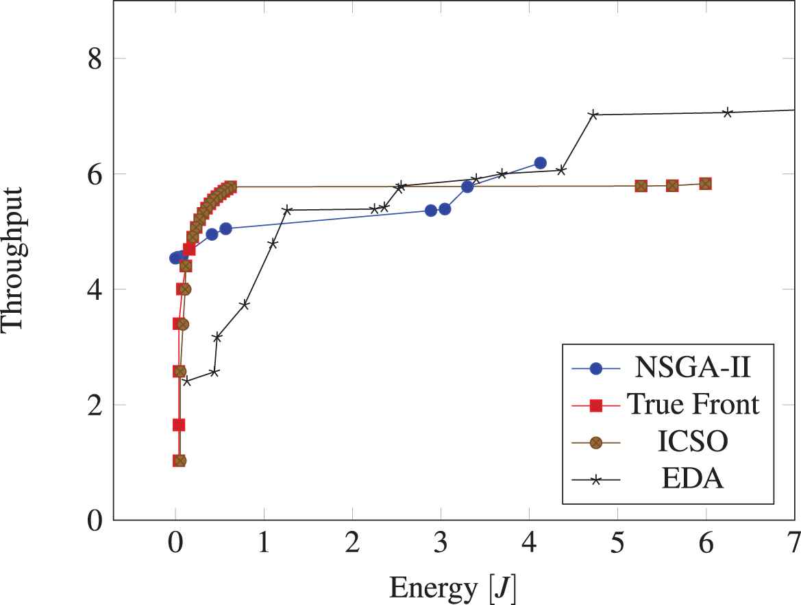Pareto front energy consumption and throughput values for NSGA-2II and True Pareto-front.
