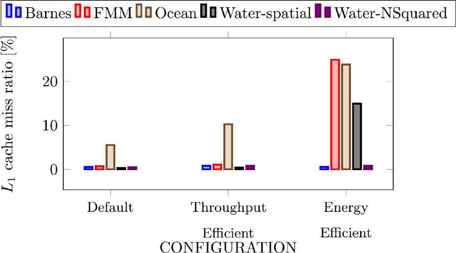 To evaluate the Pareto set obtained using ICSO algorithm, we have selected two configurations from the set of twenty configurations shown in Table 3 for detailed simulations i.e. one configuration with minimum energy consumption, we call it energy efficient configuration and second configuration with maximum throughput, we call it throughput efficient configuration. Then, we have a default system configuration, which uses maximum available system resources, as a reference to compare the effect of system parameter variations in energy efficient and throughput efficient configurations. The default, throughput efficient and energy efficient configurations are shown in Table 5. The configurations given in this table are simulated with different SPLASH-2 benchmark applications (Barnes, Cholesky, LU, FMM, Water-Spatial and Water-NSquared) on MARSSx86 simulator. It should be noted that the default system configuration has maximum throughput but at the same time maximum energy consumption. The results of other two configurations, throughput efficient and energy efficient, are discussed with reference to this default configuration as following.