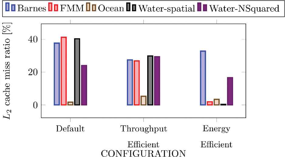 L1 cache size has a significant impact on throughput and energy consumption of an MPSoC. Therefore it is necessary to include L1 cache size variations for analysis. For performance measurement of L1 cache the performance metric miss ratio is used. L1 cache miss ratio depends on the size of the cache. The larger L1 cache size results in fewer misses. However larger cache size also increases latency, and thus consumes more power. For simulation, all SPLASH-2 applications are set to L1 cache size of 256KB, 64KB, and 1KB for default, throughput efficient and energy efficient configuration respectively. Simulation results for L1 cache miss ratio for all three configurations are shown in Figure 2. The figure shows that reducing cache size from 256KB to 64KB does not effect much on all benchmark applications except for Ocean for which the aggregate L1 miss ratio increases to 10% from default 5%. For energy efficient configuration reducing L1 cache size from 256KB to 1KB increases the aggregate L1 miss ratio from 15% to 20% for FMM, Ocean, and Water-Spatial as compared to the default ranges from 1% to 5%. For Barnes and WWater-Nsquared the miss ratio remains almost the same. The proposed architecture makes the use of a shared level 2 (L2), uniform cache memory. For simulation, all SPLASH-2 applications are set to L2 cache size of 2MB for all three configurations. Simulation results for L2 cache miss ratio for all three configurations are shown in Figure 3. This figure shows that for throughput efficient configuration L2 miss ratio is reduced significantly except for Ocean and Water-Nsquared for which it is increased from 1% to 5% and 25% to 30% respectively. For energy efficient configuration an overall reduction in miss ratio is observed for almost all the applications. The least reduction in miss ratio can be observed in case of Barnes for which it reduces from 38% to 35% only. A nominal increase of 2% is observed for Ocean benchmark.